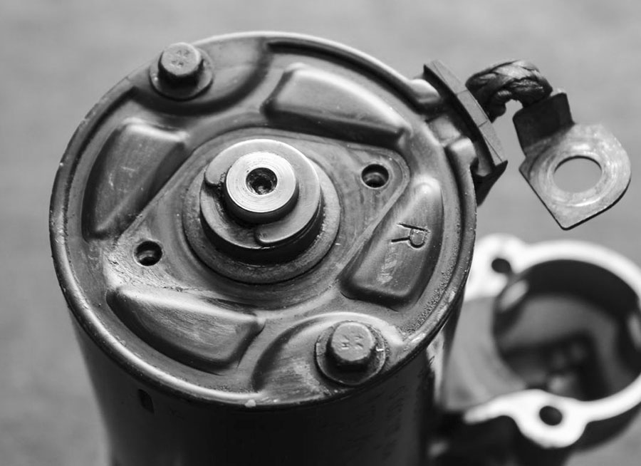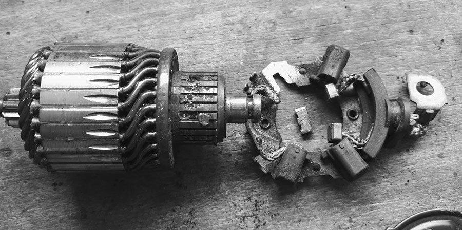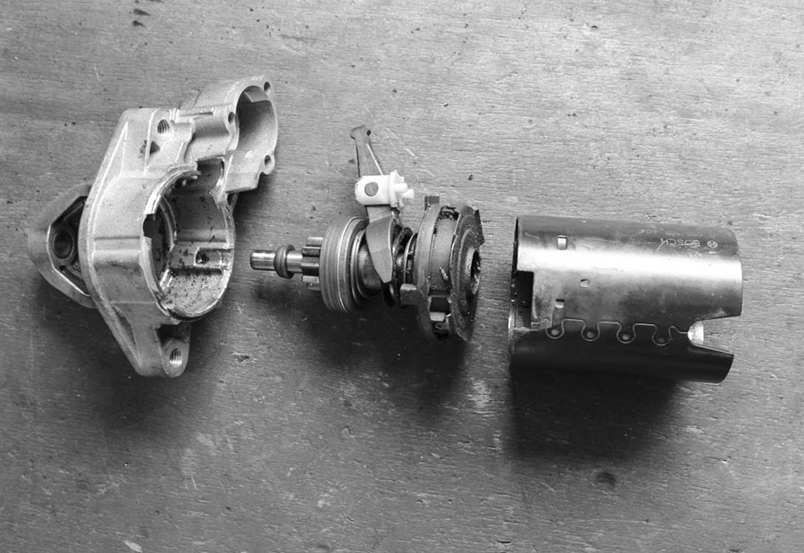 Sollte der Austausch des Magnetschalters keine Besserung gebracht haben, muss nun das Gehäuse des Anlassermotors geöffnet werden. Auch wenn Starter heutzutage bei zahllosen Herstellern vom Band purzeln, so sind sie doch fast immer gleich aufgebaut und ähneln Boschens Ur-Anlasser aus den 40er Jahren sehr. Typischerweise sind die Baugruppen des Geräts elegant aus mehreren Teilen zusammengesteckt und werden von zwei oder vier langen Schrauben („Zugankern“) zusammengehalten.