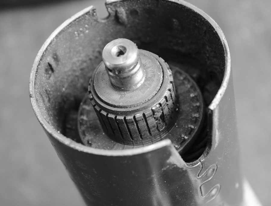 Hat man den Rotor rausgezogen, werden die Magneten im Inneren des Gehäuses sichtbar. Ebenso sieht man im unteren Teil das Planetengetriebe, welches die Drehzahl des Elektromotors in ein hohes Drehmoment umwandelt, um den Motor gegen die Kompression durchzuorgeln. Getriebe abstecken, von altem Fett und Staub befreien und anschließend neu fetten.