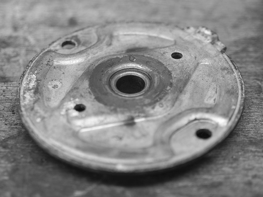 Das hintere Lager selbst ist nur in den seltensten Fällen ausgejuckelt. Zur Prüfung Welle und Lager trockenreiben und ineinanderstecken: Hier darf etwas Spiel fühlbar sein. Neue Lager liegen dem Reparatursatz typischerweise bei – altes Lager herausschlagen und die neue Sinterbuchse vorsichtig mit einem Dorn auf ihren Platz begleiten.