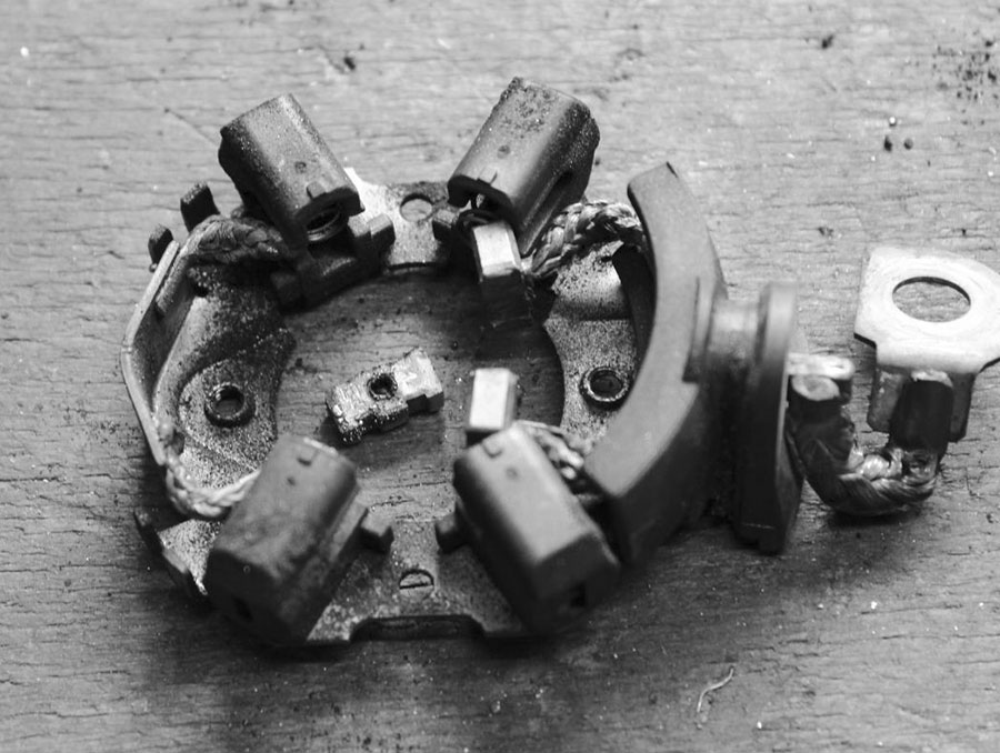 Die kleinen Lümmel sind heutzutage immer fest auf dem Bürstenhalter verlötet und werden nur noch im Satz und komplett mit diesem Halter ausgetauscht. Ein Reparatursatz zusammen mit den Gleitlagern des Motors kosten rund 20 Euro und verleihen dem Starter neue Stärke.
