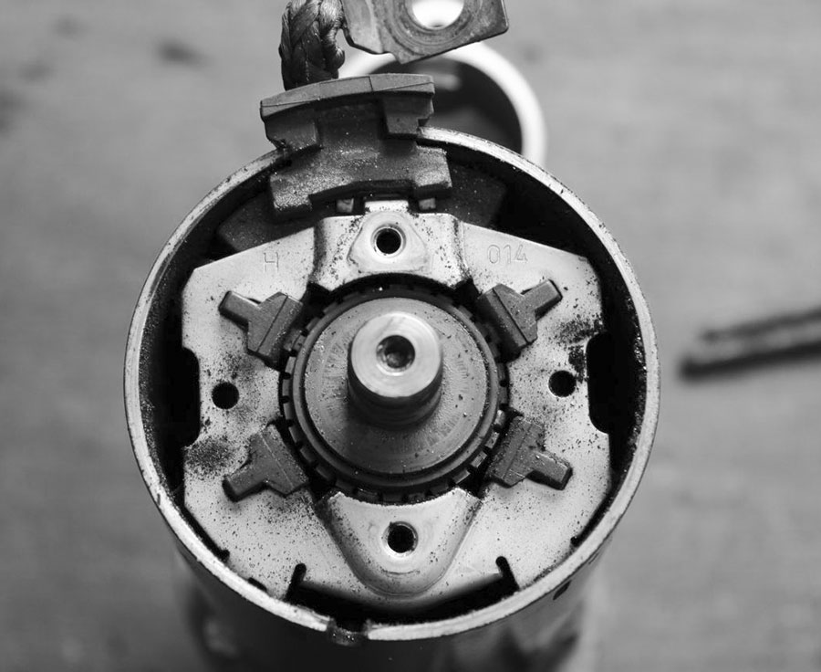 Damit der Elektromotor in jeder Stellung anläuft, besitzt er viele Wicklungen und vier Bürsten (oder „Kohlen“), die auf dem Bürstenhalter hocken. Staub und Abrieb vom Bürstenfeuer sind an dieser Stelle normal, sauber machen schadet nichts. Als nächstes nach dem Restzustand der Kohlen schauen: Sind diese noch lang genug und können noch federn, oder hängen sie schon im vorderen Anschlag? Falls ja oder kurz davor – nicht lange fackeln und die Kohlen tauschen.