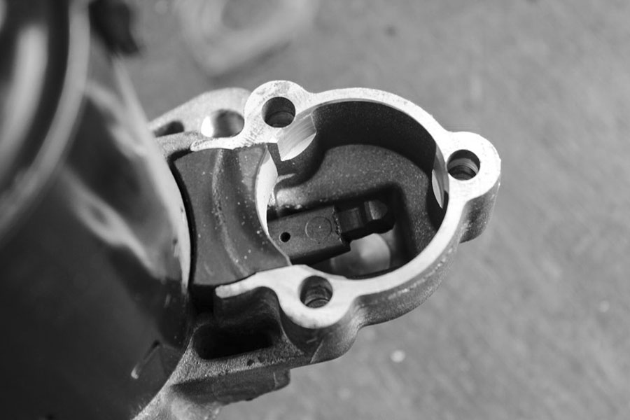 Ein Blick in den Glockenkörper zeigt den Hebel, der für das Ein- und Ausrücken des Ritzels verantwortlich ist. Hier muss der neue Magnetschalter korrekt eingehängt werden – ein bisschen Fett oder Kupferpaste kann ebenfalls nicht schaden.