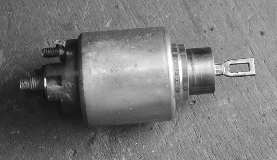 Damit hat der Magnetschalter verloren und verlässt seinen angestammten Platz. An seiner Spitze befindet sich die Lasche, mit deren Hilfe das Ritzel des Starters verschoben wird. Der Kolben, auf dem die Spitze sitzt, lässt sich leicht verschieben (wenn nicht, leicht mit einfetten). Den kompletten Schalter gibt es als Ersatzteil für kleines Geld, Reparatursätze mit neuen Kontaktplatten, Kolben und Federn bietet der Handel eigentlich nur für sehr alte Modelle an.