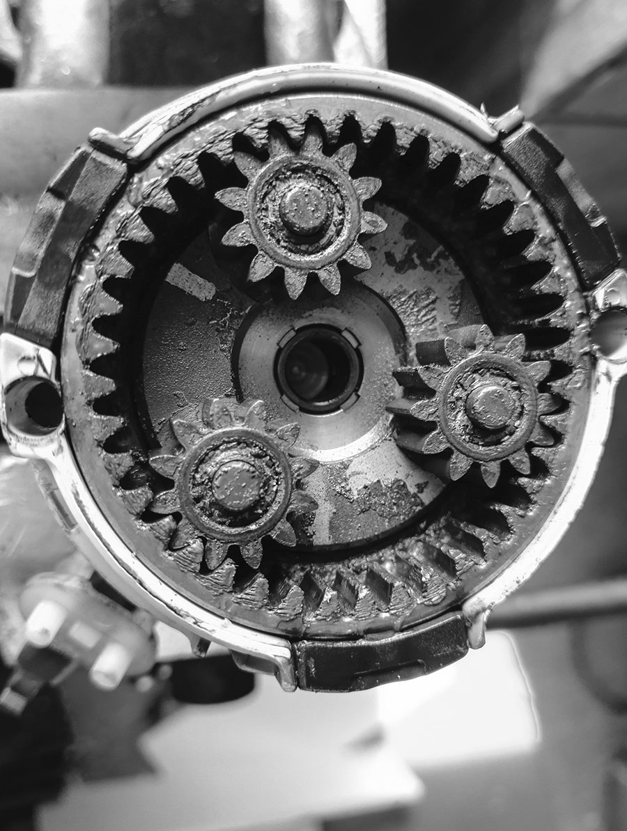 Beim Zusammenbau die Welle auf der das Ritzel läuft leicht einfetten, ebenso den Planetensatz und die beweglichen Teile der Ausrückgabel.
