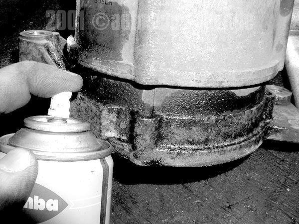 Das Lichtmaschinengehäuse besteht aus zwei Teilen. Dem eigentlichen Gehäuse und dem Lagerschild, in dem das vordere Lager sitzt. Beides wird durch vier Zugankerschrauben zusammengehalten. Die Gewinde der vier Schrauben auf der Rückseite des Generators mit Caramba behandeln.