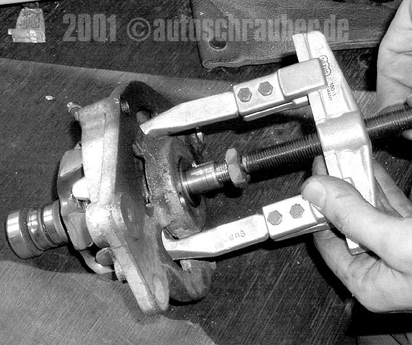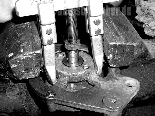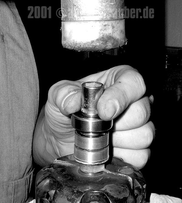 durch das Lager zu treiben. Es geht auch anders. Wer hat, benutze eine Presse. Die Gehäusehälften wieder richtig zusammensetzen und die Zugankerschrauben festziehen.