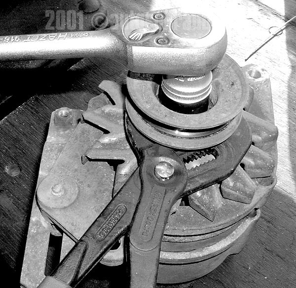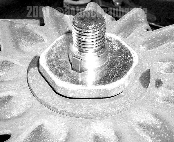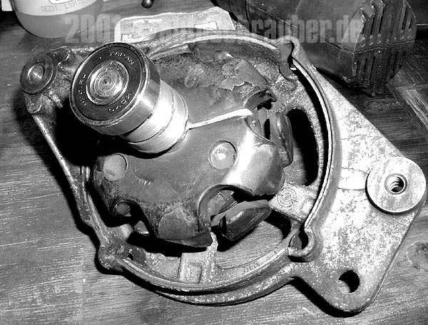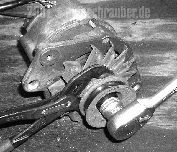 Riemenscheibe demontieren. Dazu die Zentralschraube mit einer Stecknuß SW 22 lösen. Dabei mit einem Schlüssel oder eine großen Wasserpumpenzange gegenhalten.
