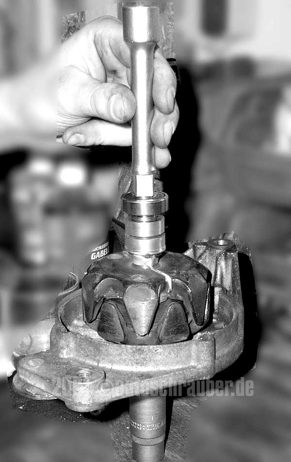Eine Zündkerzennuss, auf die man die Distanzscheibe auflegt, eignet sich gut als Unterlage, um die Welle