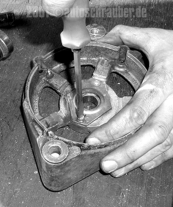 Den Bürstenhalter wieder in die Lichtmaschine einsetzen, die Schrauben festziehen. Die Keilriemenscheibe montieren.
