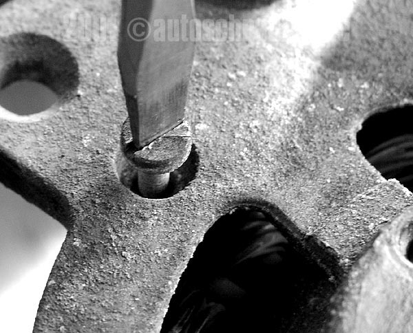 Jetzt die Zugankerschrauben lösen. Dazu einen wirklich hundertprozentigen Schlitzschraubenzieher verwenden, dessen Klinge gerade eben so in den Schlitz paßt. Wenn man so eine Schraube vermauert oder abreißt (-Caramba!) steht man ganz schön auf dem Schlauch.