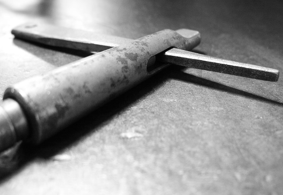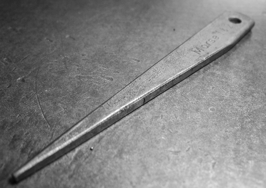 Die Spindel oder Hülse, in der ein solcher Bohrer steckt, hat als Gegenstück dazu ein Langloch, durch das man einen Keil schieben kann, um den Kegel vom Grund abzudrücken. Dieser Keil oder Austreiber ist natürlich auch in verschiedenen Größen erhältlich und das zum Werkzeugwechsel unentbehrliches Utensil.