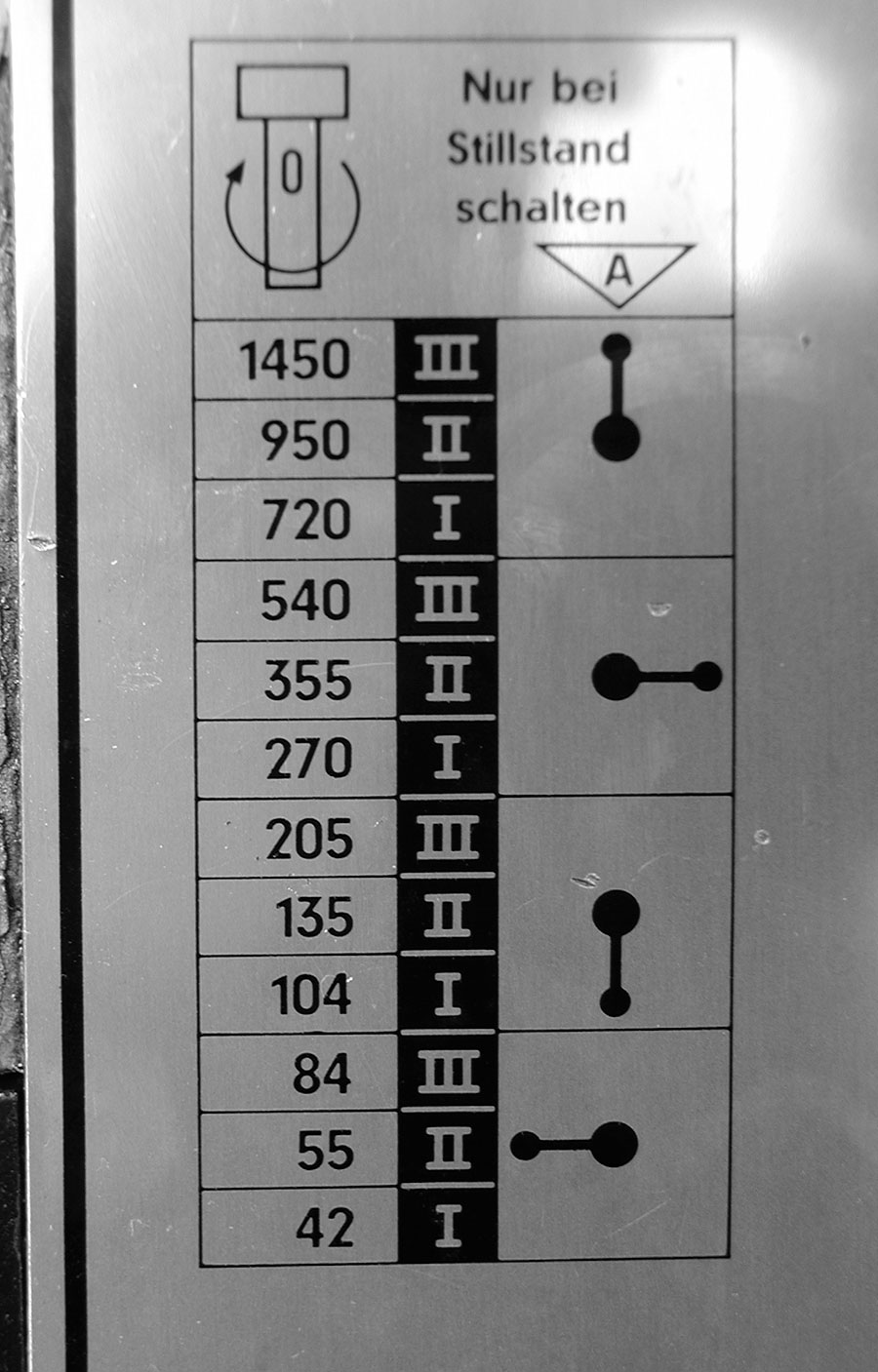 Richtig langsame Drehzahlen sind allerdings mit dieser Technik nicht hinzukriegen, weil die Riemenscheiben reichlich groß würden und wenigstens in die Maschine hineinpassen müssen. Für ein paarhundert Eulonen mehr stehen Maschinen mit Zahnradgetriebe im Schaufenster. Das ist nicht nur einfacher in der Bedienung, sondern kann auch mehr Kraft übertragen. Mehr Kraft ermöglicht dickere Bohrer und die brauchen niedrigere Drehzahlen. Die Gänge werden mit einem oder mehreren Hebeln eingelegt und ermöglichen schnelleren Gangwechsel, zu dem Spindel und Motor allerdings stillstehen müssen.
