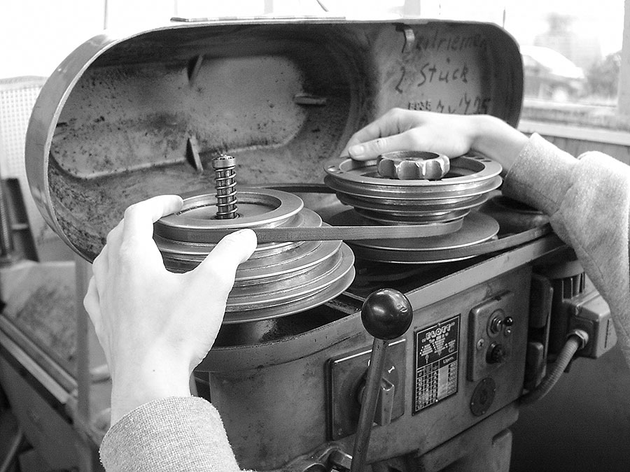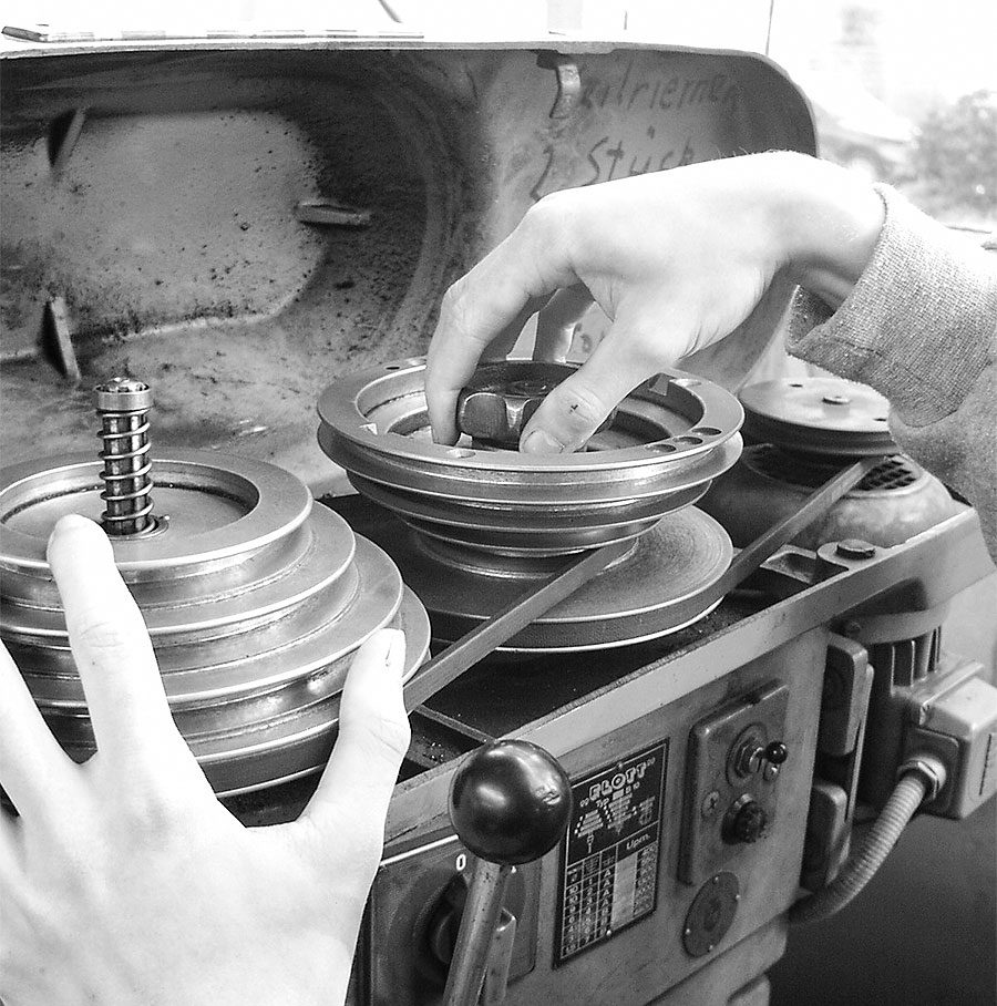 Mit so einem Getriebe lässt sich die Werkzeugdrehzahl runter- oder raufsetzen und vor allem das Drehmoment an der Spindel potenzieren. Je nach Geldbeutel unterscheiden sich natürlich auch die Bauformen der Getriebe. Hier im Bild ist zuerst die schlichte Variante, bei der die Drehzahl über Riemenscheiben eingestellt wird. Bevor also der Knethaken in den Hefeteig eintaucht, sollte man sich Gedanken über die nötige Drehzahl des Küchengeräts machen (kommt noch genauer) und dann den Riemen umwerfen. Dazu muss der Keilriemen entspannt und auf die richtige Riemenscheibe gelegt werden. In Verbindung mit der richtigen Motordrehzahl ermöglicht die Maschine jetzt kommodes Bohren, Senken oder Reiben.