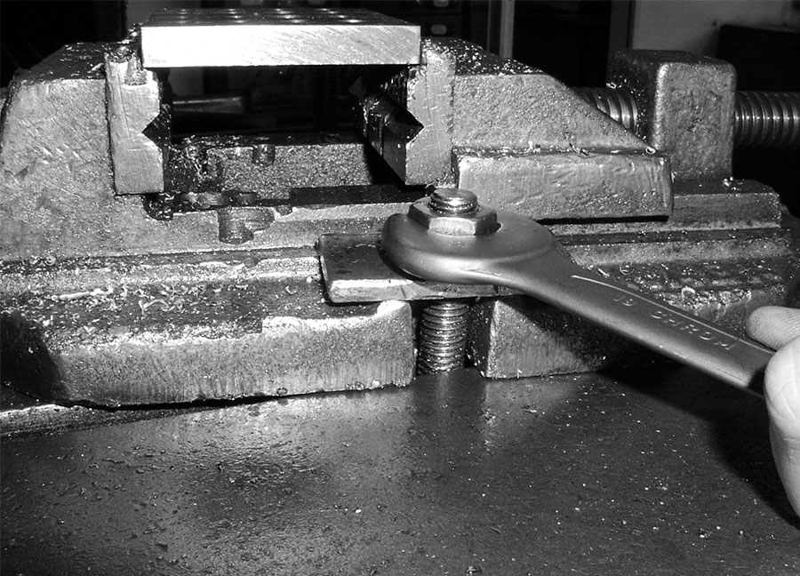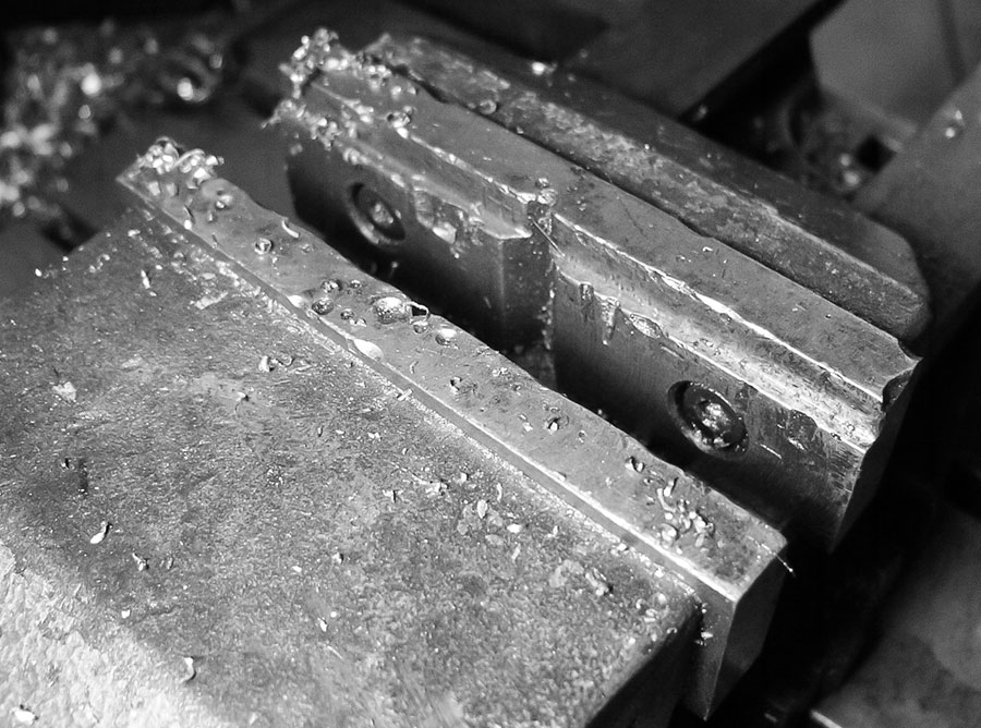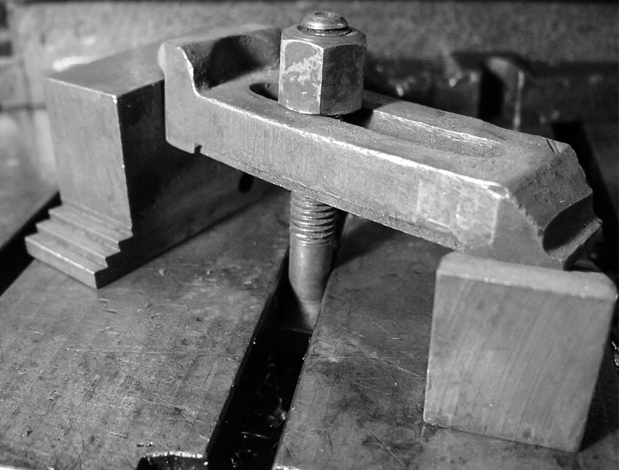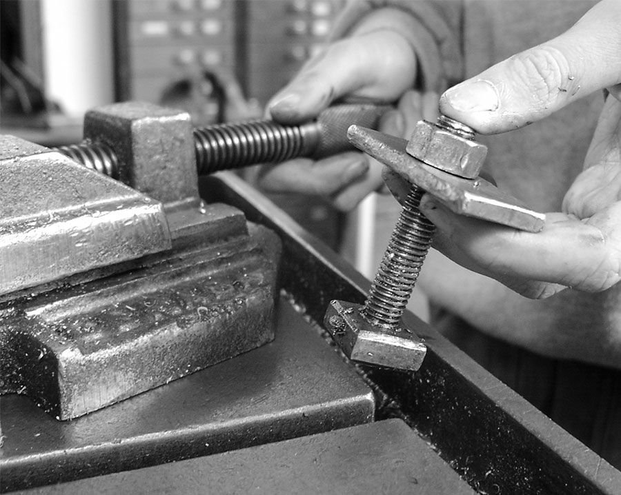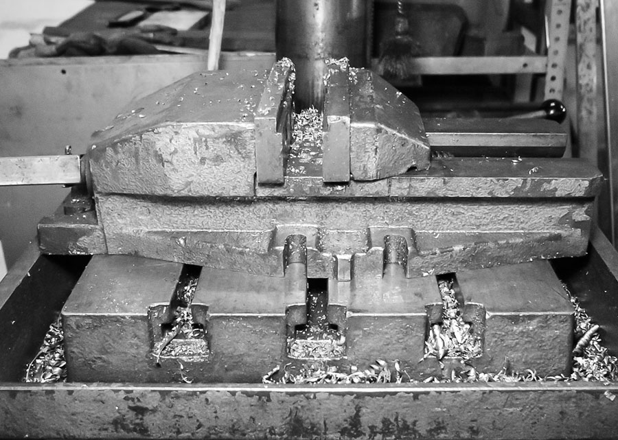 Je nach Qualität ist das ein eher günstiges Teil mit gegossenen Backen oder ein geschmiedetes Luxusmodell mit gefrästen und austauschbaren Backen. Das ist immer vorzuziehen, wenn es darum geht, Bohrungen wirklich winkeltreu anzubringen oder tiefe Gewinde sauber einzusetzen. In jedem Fall ist dieser Schraubstock das, was allermeist auf dem Tisch der Bohrmaschine liegt. Runtergenommen wird der Schraubstock nur, wenn größere Teile nicht zu spannen sind oder sie eine saubere Rückseite haben und leicht deshalb leicht zu bearbeiten sind.