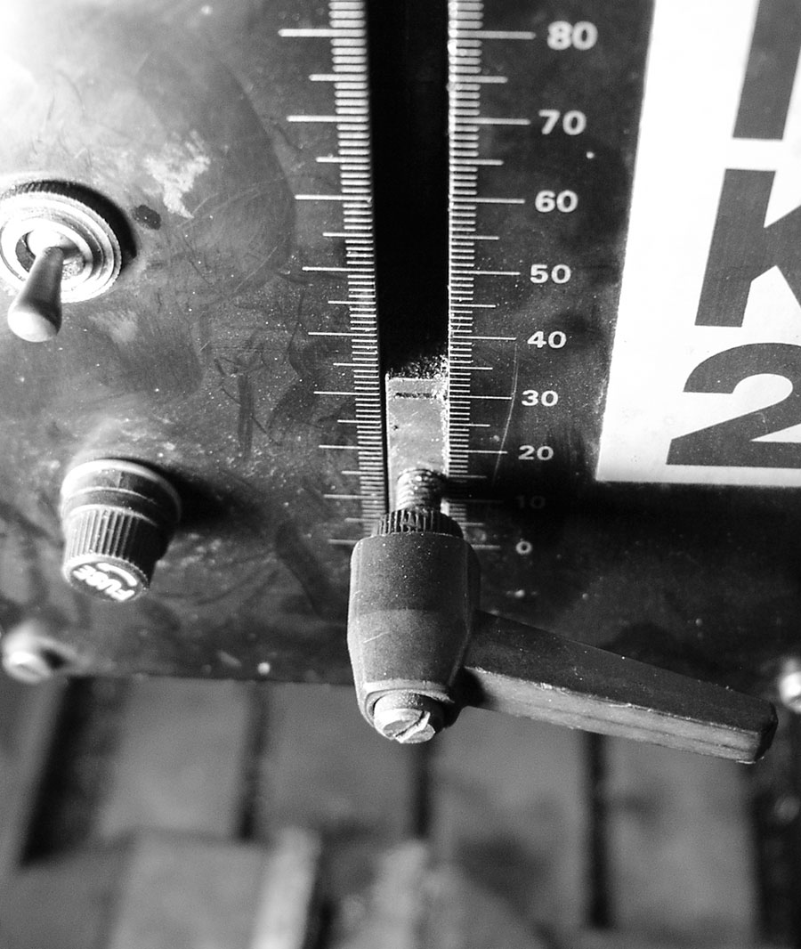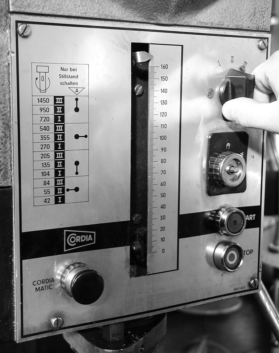 Der Vorschub pro Spindelumdrehung lässt sich einstellen, so dass man als Herr der Späne bei laufender Leier nur den Vorschubhebel einlegt und für die Kühlung sorgen muss – die Maschine bohrt von selbst. Großer Nachteil dieses automatischen Vorschubs ist seine mangelnde Sensibilität. Das Ding bohrt und drückt, bis irgendein Spannstift abschert, sich das Bohrfutter spektakulär in den Tisch fräst oder der Schraubstock um den Bohrer kreist.