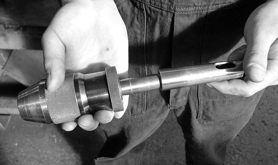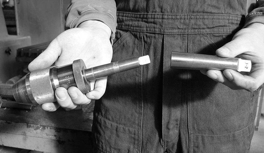 Diese Adapter heißen „Reduzierhülsen“ und machen aus MK3 das kleinere MK2 oder MK1. Wie bei LEGO lassen sich Reduzierhülsen, Spannfutter und Bohrwerkzeuge auch munter miteinander kombinieren. Und gleichzeitig existieren auch Maschinenfutter, die nicht für die Handbohrmaschine gedacht sind, sondern mit Morsekegel ausgerüstet in eine Säulenbohrmaschine eingesetzt werden.