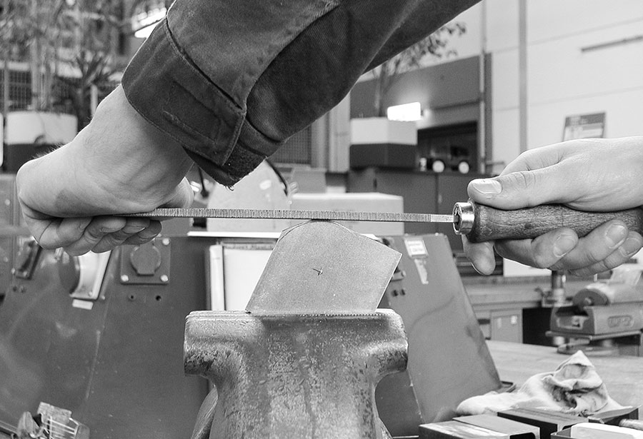 Wir zeigen das Feilen eines Außenradius hier wieder unter Laborbedingungen der Lehrwerkstatt. Ausgangspunkt ist ebenfalls ein Flachstahl von 10mm, der mit einem Außenradius von 30mm versehen werden soll. Wie schon beim Innenradius haben wir als Hilfsmittel eine Schablone, diesmal natürlich andersrum.