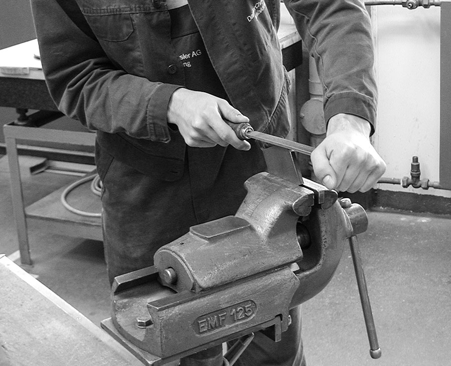 Ausserdem kippt man die Feile in der Bewegung meist zu einer Seite hin. Um das zu verhindern, dreht man das Werkstück im Schraubstock ab und an um und feilt von der anderen Seite.
