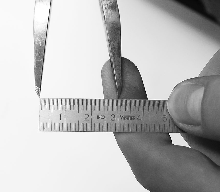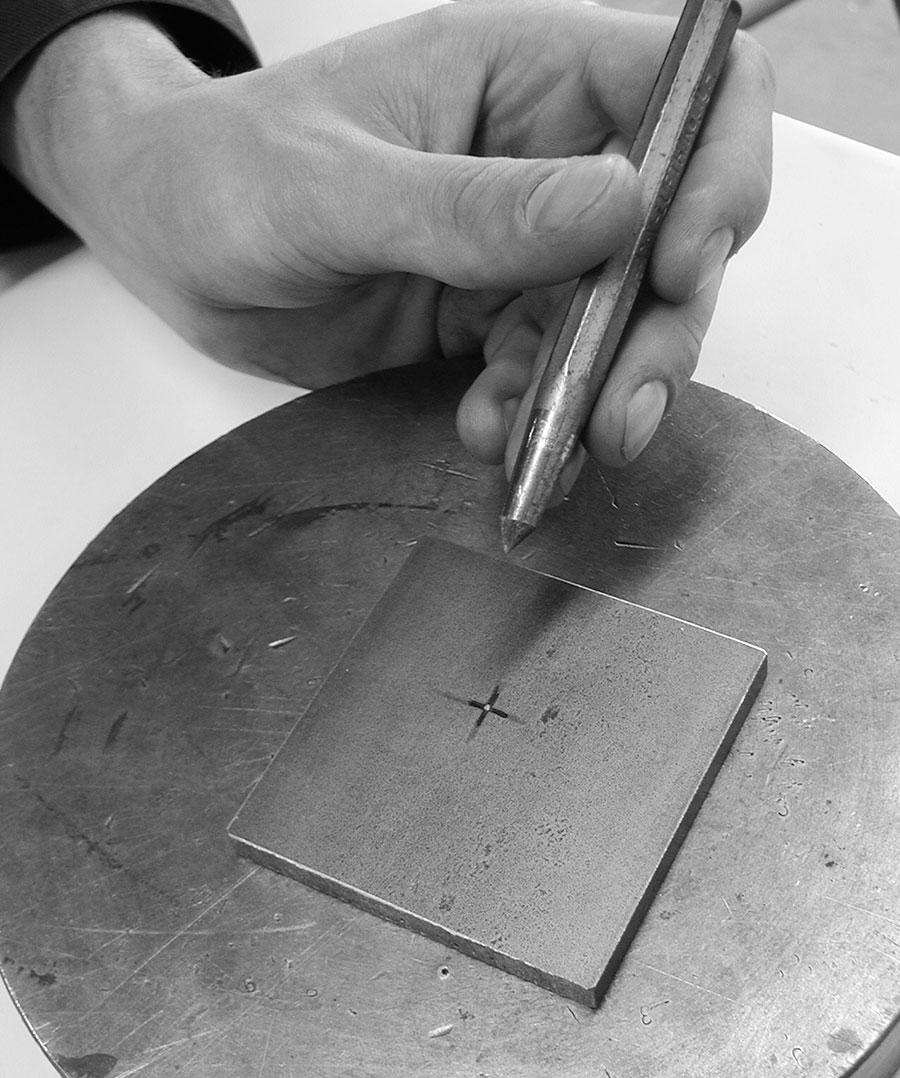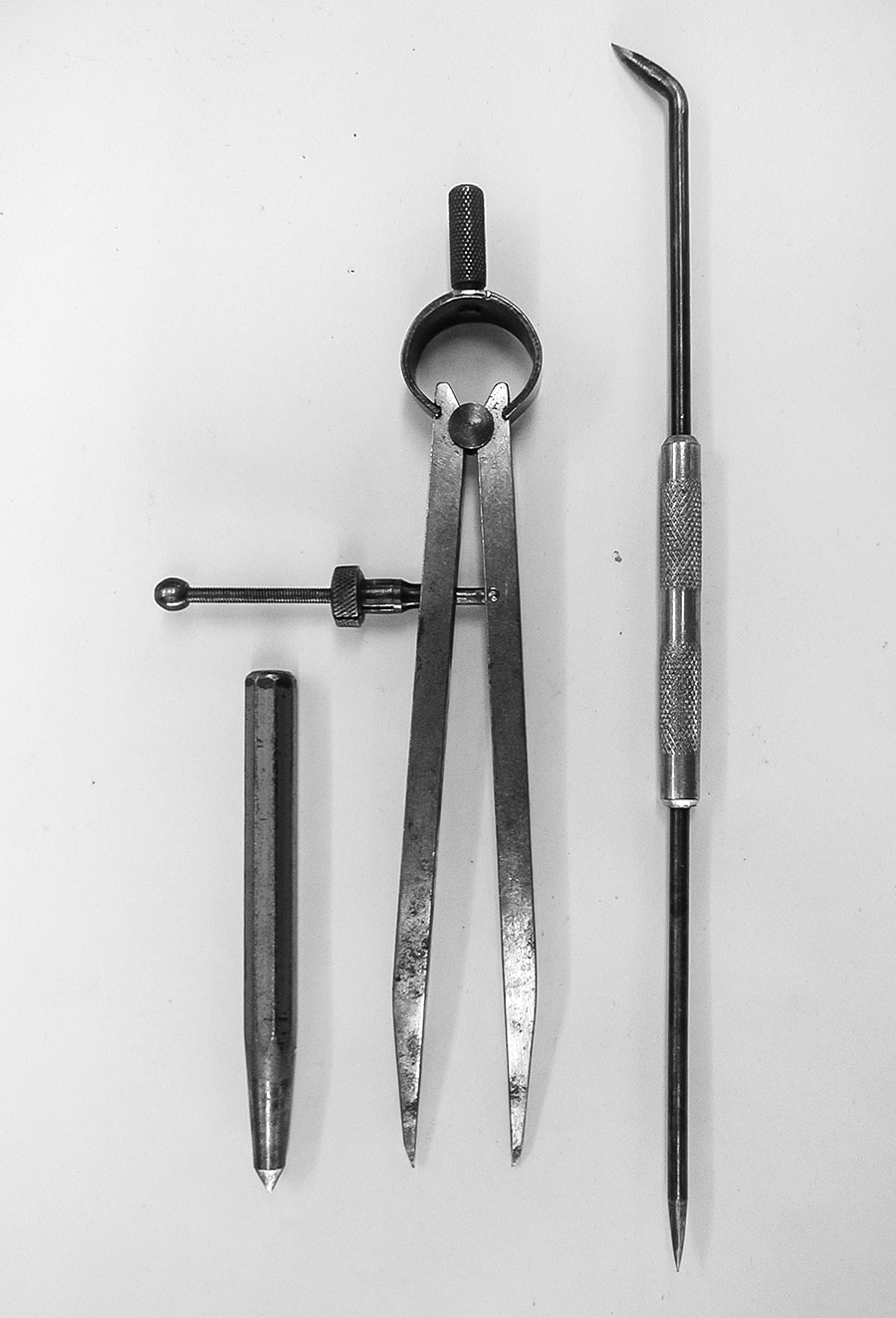 Mit einem Anreißzirkel, der sich von einem Schulzirkel nur darin unterscheidet, dass er eine gehärtete Spitze anstelle einer Bleistiftmine hat, reißt man jetzt den Viertelkreis. Dazu nimmt man das Maß 30mm vorher in den Zirkel.