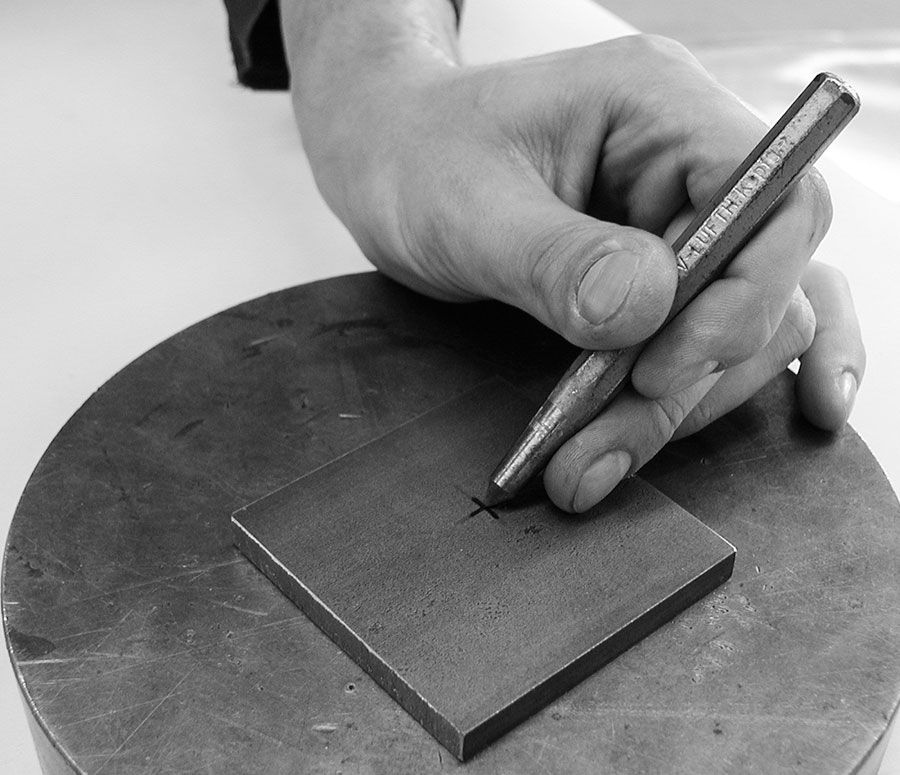 Da macht man einen kleinen Riss und zieht einen weiteren Riss 90° in das Werkstück. Macht man das von beiden Seiten, erhält man einen Schnittpunkt. Dieser Schnittpunkt ist das Zentrum des Kreises, der genau in der Ecke liegt. Hier setzt man einen Körnerpunkt. Batsch.
