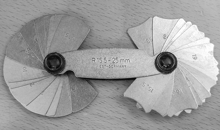 So eine vorgeschnitzte Schablone hat man aber nicht immer zur Hand: Hilfe findet man in Form von Radienlehren. Die Dinger haben entfernte Ähnlichkeit mit einem Schweizer Taschenmesser und beherbergen Blechstreifen, die am Ende verschiedenste Radienabschnitte haben. Eine Seite der Lehre ist für Außenradien, eine für Innenradien. Auf dem Blechstreifen ist die Größe des Radius eingeschlagen.
