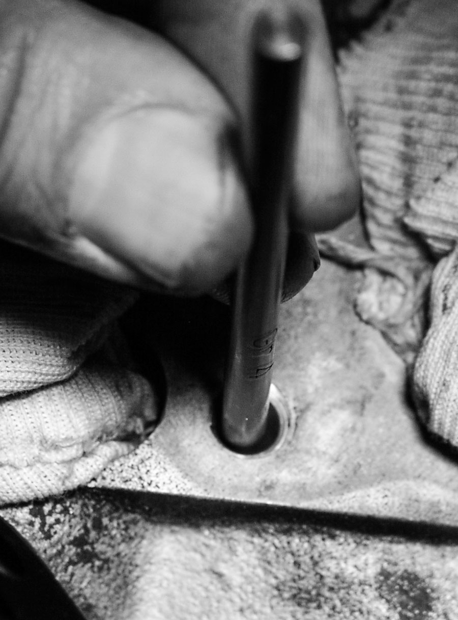Dem krummen Maß beim Bohren folgt ein eigens geschnitzter Gewindebohrer. Dieser Bohrer sollte ebenfalls in der Drahtgewindeschatulle enthalten sein und formt den Sitz für die rettende Wendel.
