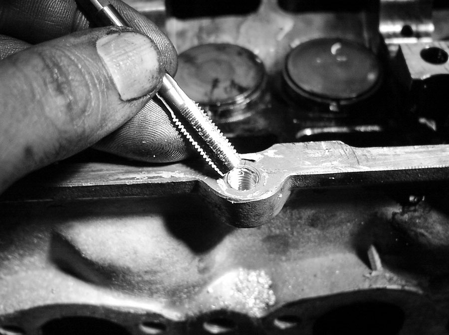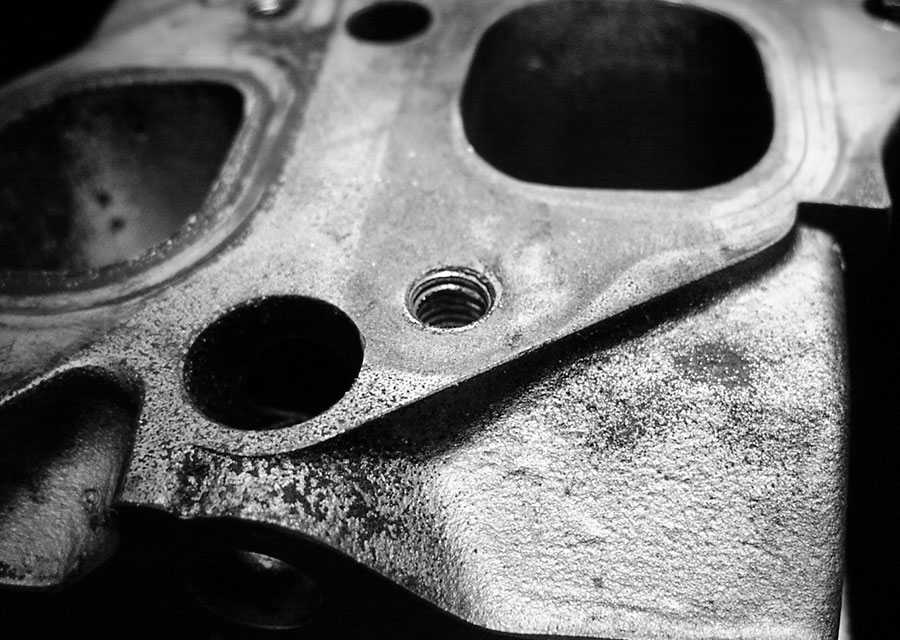 Der Zylinderkopf des Schlacht-Chryslers bleibt uns auch für die Wendel-Applikation erhalten. Das hier gezeigte Loch liegt nahe des Abgaskanals und ist deshalb ein typischer Kandidat für den Drahtgewindeeinsatz.