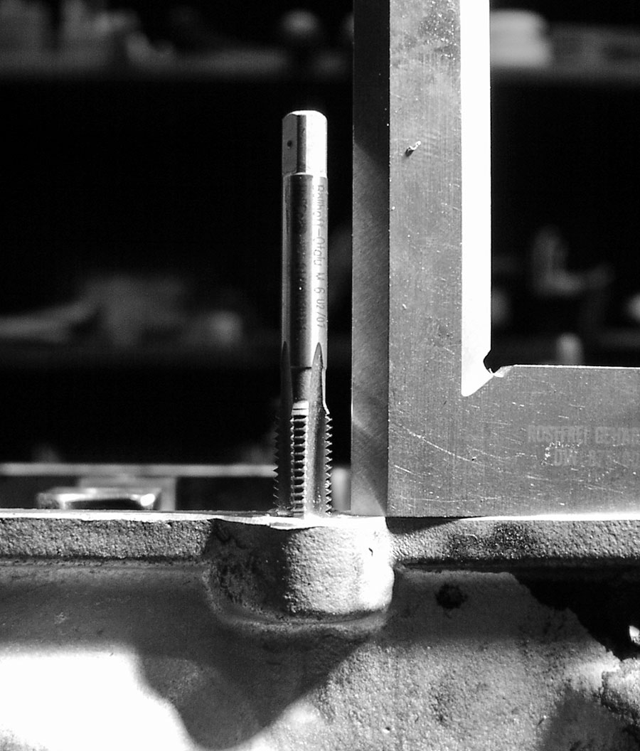 Damit dreht man das Ding in die Bohrung. Um später ein lotrechtes Gewinde zu haben, sollte man die Winkligkeit zwischendurch immer wieder kontrollieren. Alle zwei Umdrehungen eine halbe Umdrehung zurück kurbeln, um den Span zu brechen