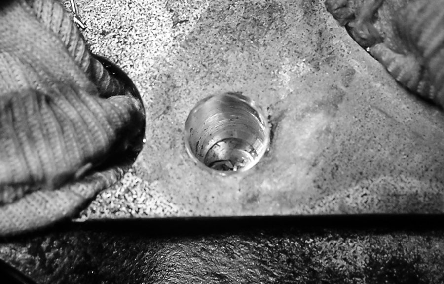 Damit alle Motor-Innereien auch nach dem Aufbohren noch aseptisch sauber und spanfrei sind, muss die Bohrstelle fein säuberlich abgedeckt werden und darf nicht wie im Fall dieses Zylinderkopfs offen liegen. Den Bohrer mit Fett einzuschmieren und schön langsam aufzubohren, hilft ebenfalls, hässliche Späne fern zu halten.