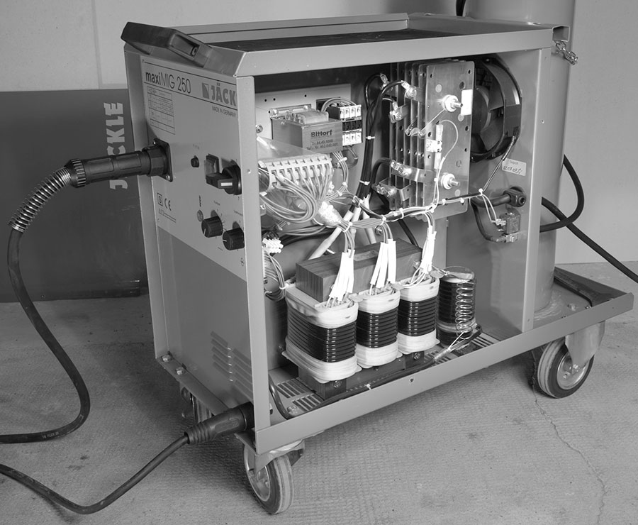 Geht es um das „Zubraten“ von Löchern im vergilbten Vectra-Schweller oder das Anfertigen einer gewagten Hilfskonstruktion, wird meist diese Wunderkiste bemüht. Woraus besteht aber ein Schutzgasschweißgerät? Was ist das überhaupt? Wie schon im Artikel „Schweißtrafo“ breitgetreten, bildet ein Trafo im Inneren des Geräts das Herzstück aller Schutzgas-Schweißerei.