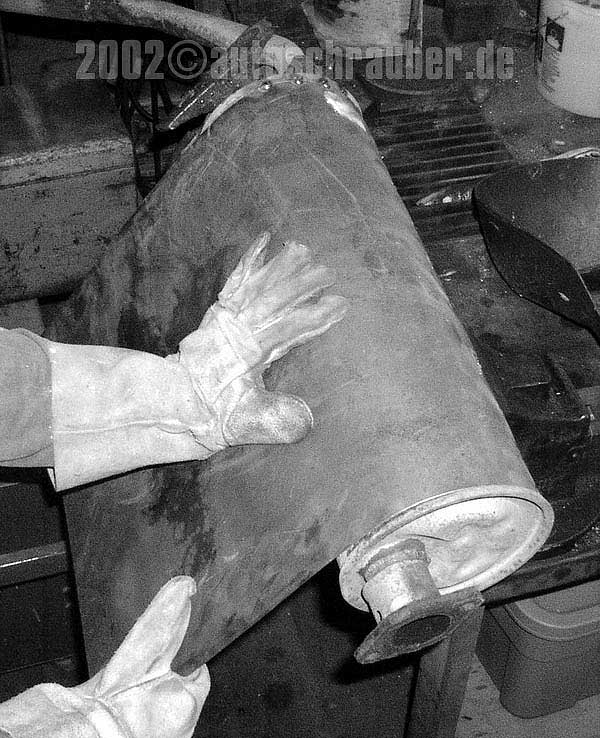 Wessen pekuniäre Lage nicht zulässt, zum Teile-Dealer des Vertrauens zu eilen und einen neuen Endtopf zu erflehen, dem kann mit der folgend beschriebenen Bastelei geholfen werden. Alles was man braucht: ein defekter Auspuff, Blech und ein Schutzgasschweissgerät.