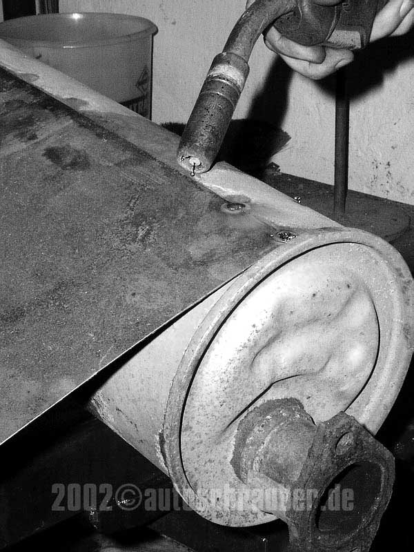 Beim Schweissen an den Flanschen ist zu beachten, dass man den Brenner auf dem Flansch ansetzt, von dort das Schweissbad kurz aufs Blech zieht und wieder zurück auf den Flansch pendelt. Merke: wer zu lange auf dem Blech rumbrät, der schmurgelt ein Loch rein. Was kontraproduktiv wäre; schliesslich versuchen wir ja, gerade ein solches dicht zu bekommen.