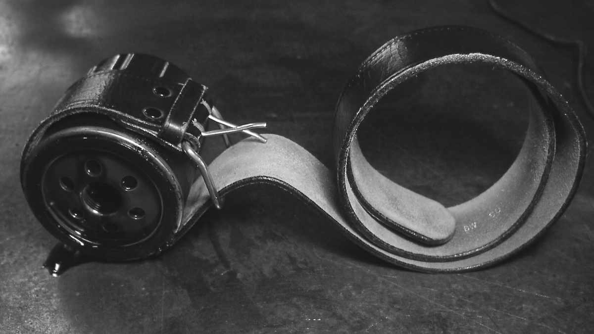 Wenn aber wilde Wüteriche das Teil mit Verlängerung angeknallt haben, wird der Wechsel zur Tortur. Üblicherweise kommen jetzt gekaufte Ölfilterschlüssel zum Einsatz; alternativ auch der simple Schraubenzieher. Wer allerdings einen Hosenriemen sein eigenen nennt, kann diesem simplen Gürtel seines Zwecks zu entrauben und um die widerborstige Patrone zu gürten.