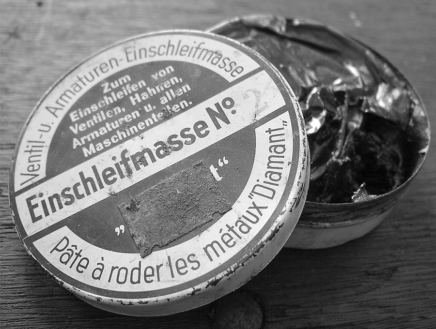 Ventileinschleifpaste besteht aus Korund in Knetmasse. Diese Bindung ist mineralisch und lässt sich, wenn die Paste nach ein paar Jahrzehnten im Werkzeugschrank mal hart wurde, mit einem Spritzer Petroleum oder dünnem Öl wieder in Richtung „auskaramelisierter Honig“ verdünnen. Ursprünglich wurde dieses Zeug vor allem zum Einschleifen von Armaturen in Dampf- oder Warmwasseranlagen gebraucht. Hier kümmerten sich Maschinenschlosser liebevoll um undichte Ventile oder Schieber, so dass es diese Masse in wenigstens 5 verschiedenen Körnungen gab.