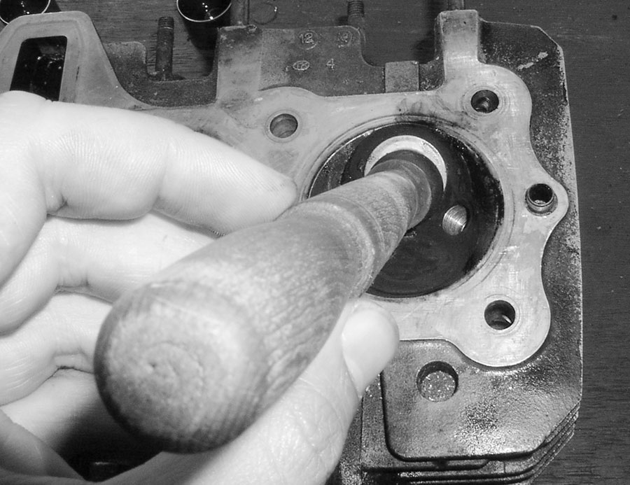 Zum Einschleifen streicht man entweder die Dichtfläche des Ventils oder den Ventilsitz dünn mit Schleifpaste ein. Jetzt steckt man das auserkorene, neue Ventil in den Sitz. Vielleicht den Schaft ein wenig einölen, damit es besser flutscht.