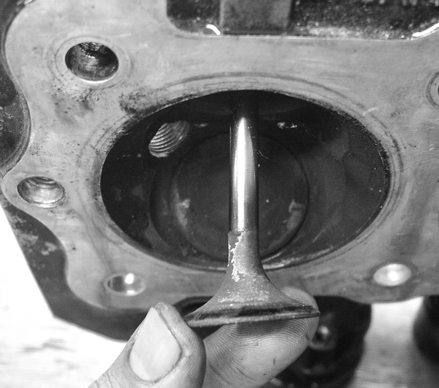 Sind diese Ventilführungen hinüber, lässt sich das fast komplett reingesteckte Ventil ganz deutlich radial hin- und herbewegen. Für einen Test also das Ventil saubermachen, Schaft und Führung blitzeblank trockenreiben und das Spiel mit den Fingerspitzen ertasten. Gaaaanz leichtes Wackeln ist erlaubt, deutliches Schlockern heißt: Führung hinüber.