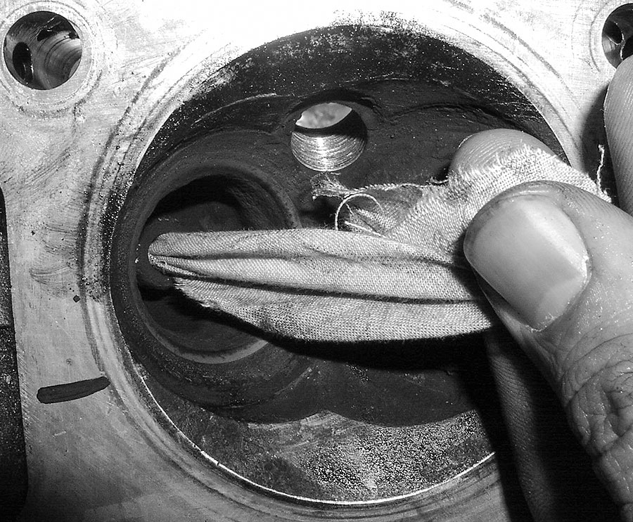 Wenn der Sitz fertig ist, muss alle Schleifpaste von Ventil und Ventilsitz runter. Klinische Sauberkeit verlangt insbesondere die Ventilführung: Um auch das letzte Atom dieser königen Masse zu entfernen, zieht man einen Streifen Stoff durch die Führung. Die neue Ventilschaftdichtung erst JETZT montieren, weil sich sonst mögliche Korundbrösel in der Nut der Dichtung verstecken. Die neue Dichtung einfach auf die Ventilschaftführung stecken: Plopp!