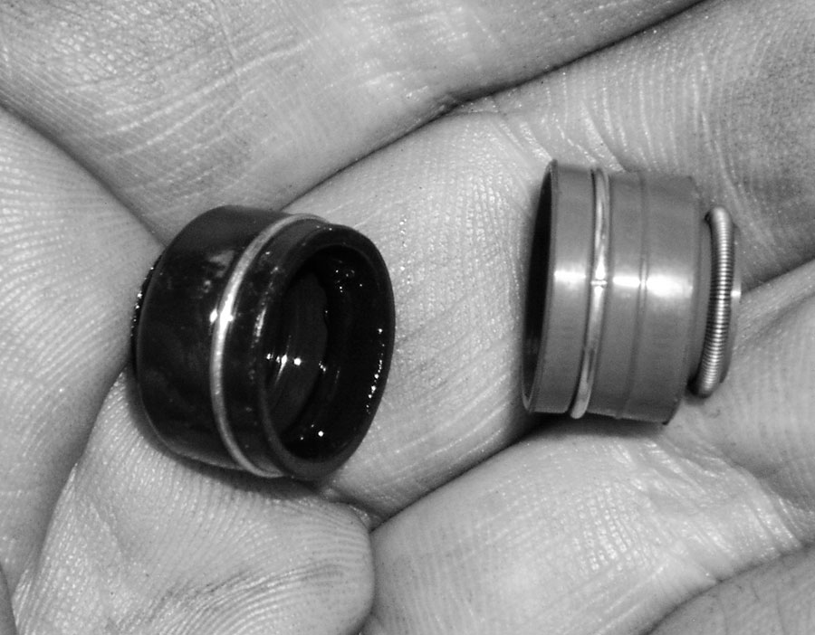 Alle Ventile laufen in Ventilführungen, die in den Zylinderkopf eingeschrumpft sind. Damit aus dem Kopf nicht ständig teures Motoröl in den Brennraum läuft, sind die Ventilschäfte nach oben hin mit Dichtringen, genauer: Wellendichtringen versehen. Wenn sich diese unscheinbaren Pfennigteile verabschiedet haben, läuft (logisch) Schmiersaft durch den Schaft in den Brennraum und sorgt für eine lustige blaue Auspufffahne. Typischerweise beim Herunterschalten / Gaswegnehmen.