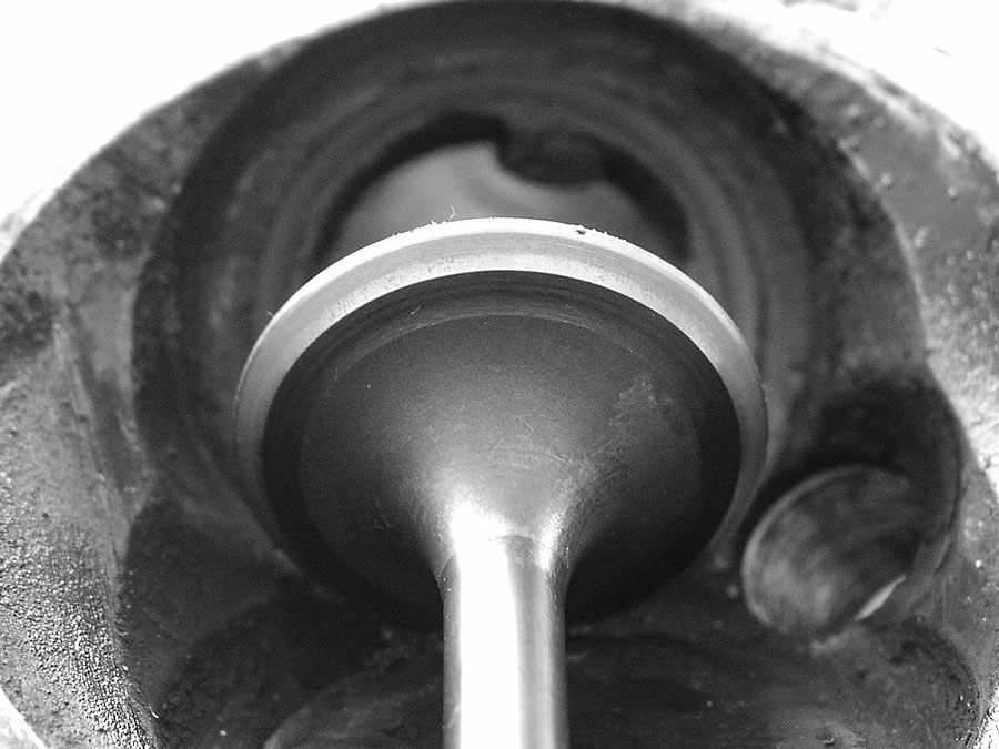 Die tragende Fläche soll einheitlich matt und grau sein. Dabei nicht zu breit oder zu schmal. Wenn sie zu weit außen oder innen liegt, deutet dass auf einen Sitz hin, der nachgefräst werden muss. Diese Fläche hier liegt in der Mitte und ist genau richtig. Will man auf Nummer sicher gehen, kann man die Dichtheit des Ventilsitzes auch noch mal überprüfen: