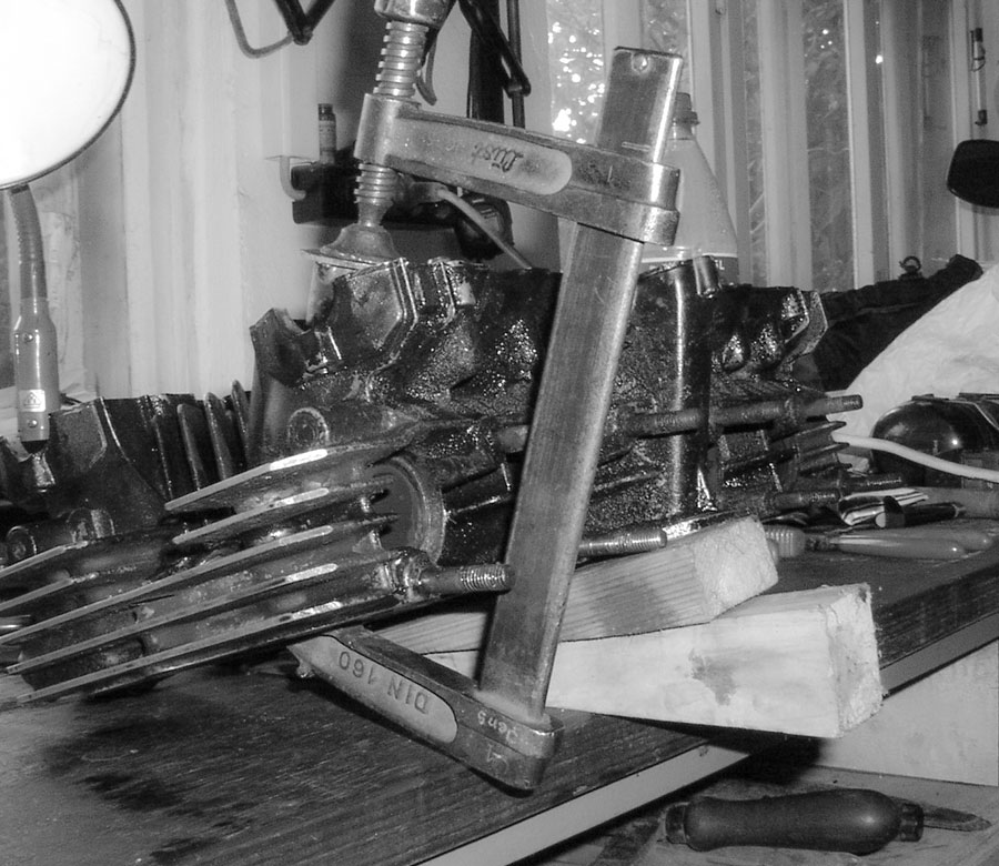 Dazu dreht man den Kopf so, dass die Ansaug- oder Auspufföffnung des jeweiligen Ventils nach oben zeigt, steckt das Ventil in den Kopf, drückt es feste zu und kippt einen Schluck Benzin oder Petroleum in den Kopf.