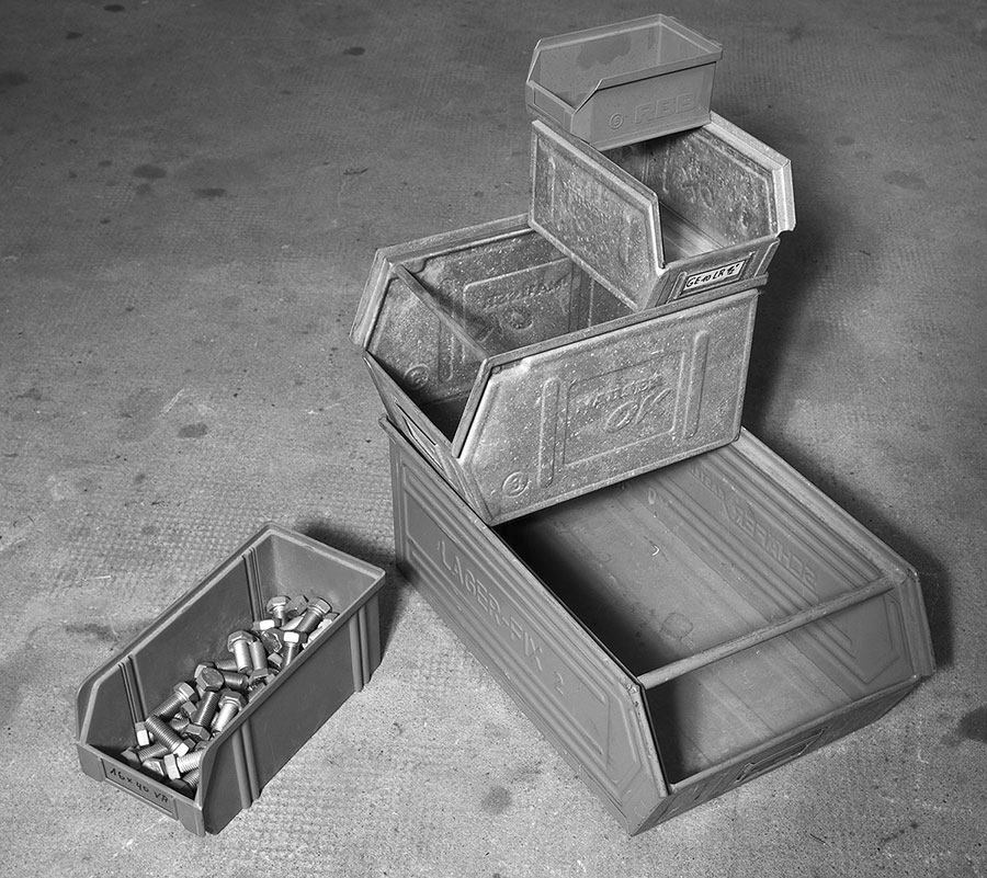 Weil Muttern, Schrauben, Splinte, Scheiben, Schmiernippel, Sprengringe oder Schraubenschlüssel nur selten lose und einzeln im frisch erworbenen Regal liegen, existieren seit dem Untergang von Karthago Stapelkisten.