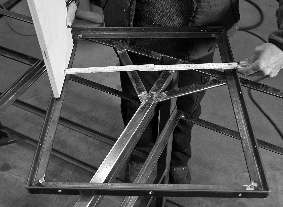Als Grundierung dient eine ebenfalls gut deckende Rostschutzfarbe. Getreu der Schlosser-Devise „Gut gerollt ist besser als schlecht gespritzt“ kommen statt Pistole oder Sprühdose altmodische Pinsel und eine Schaumstoffrolle zum Einsatz. Je nach Wetterlage und Trockenzeit kann die Optik des Möbels deswegen durchaus drei volle Tage in Anspruch nehmen, bevor es mit den Einlegeböden und der Tischplatte weitergehen kann.