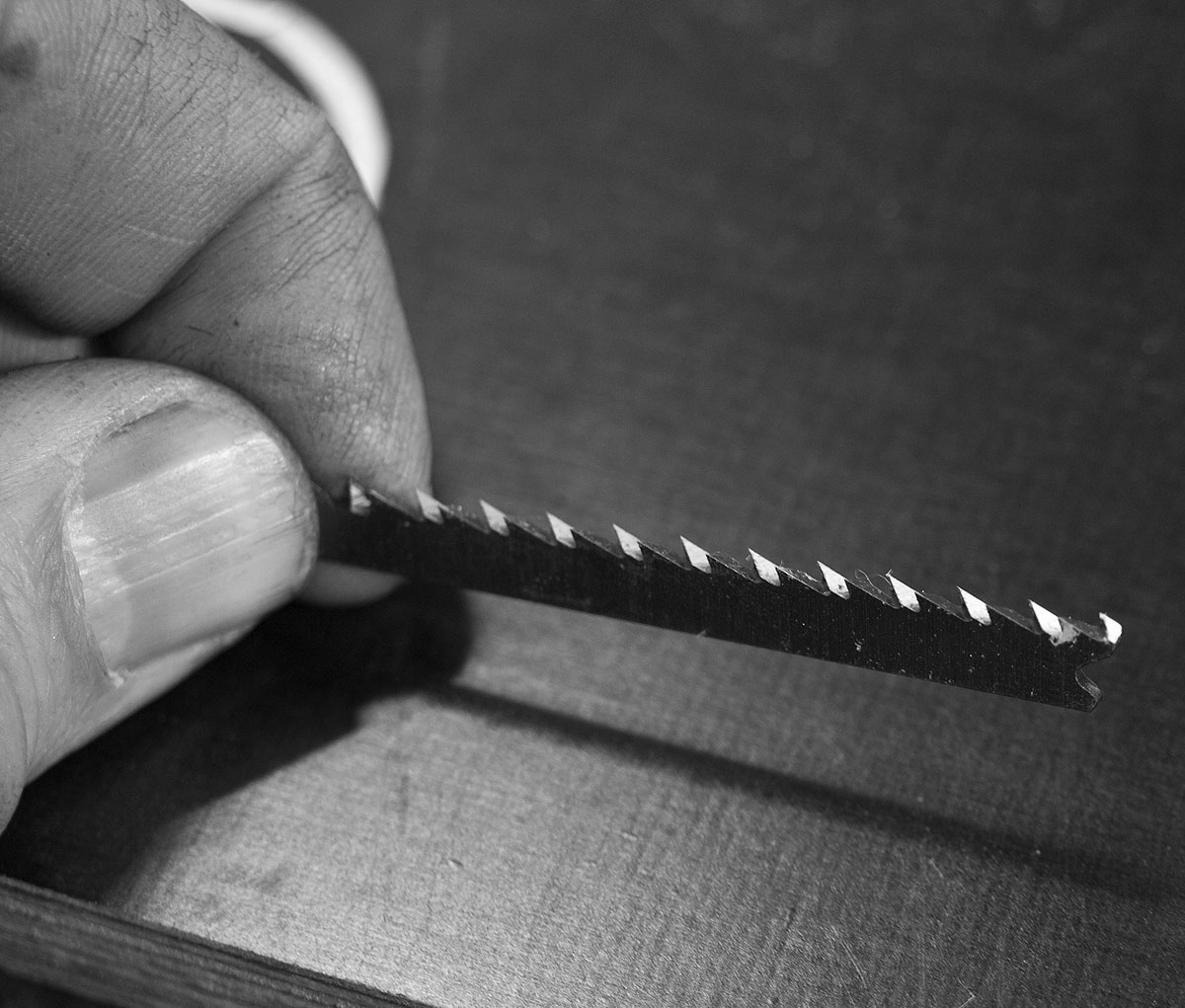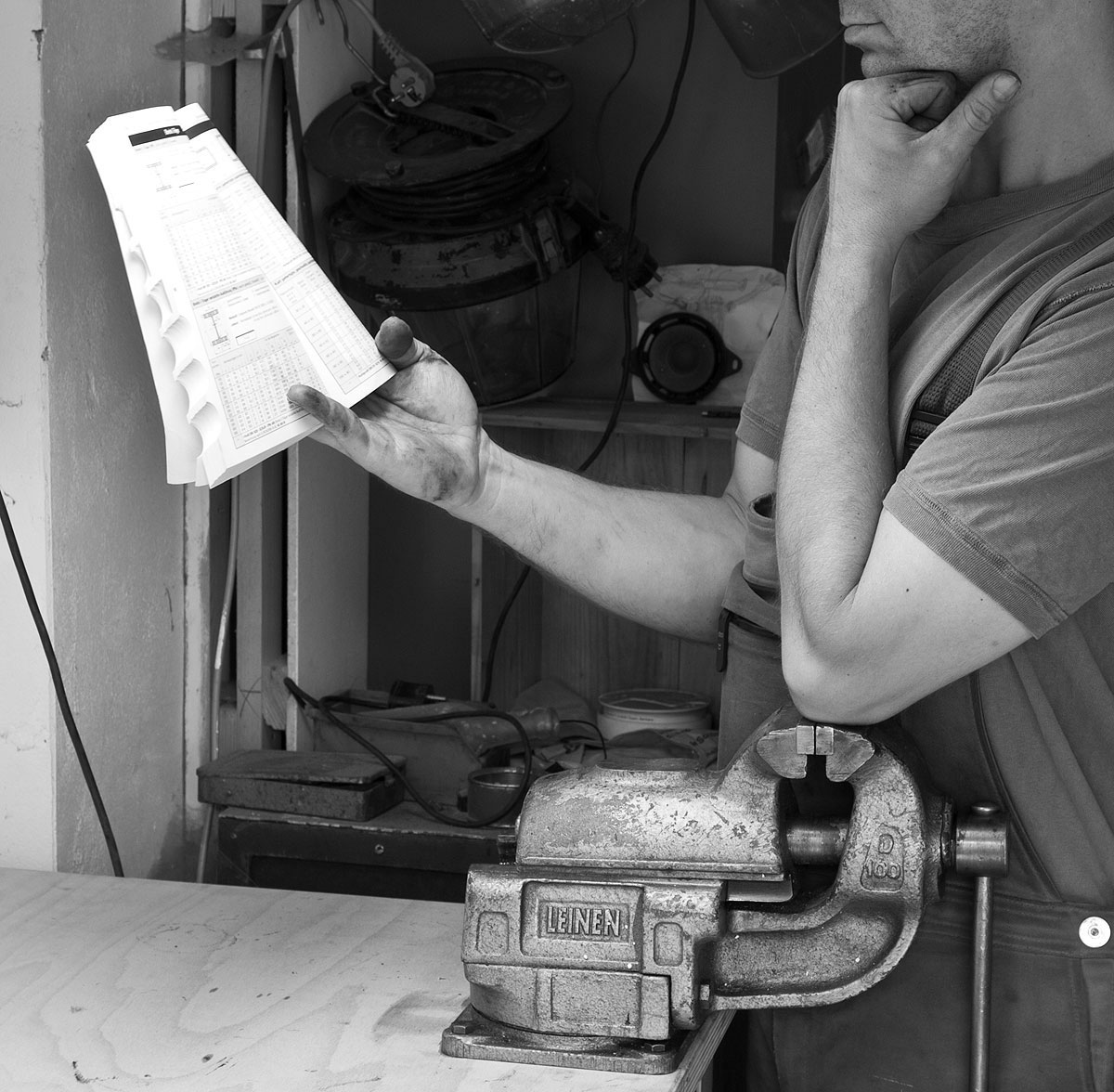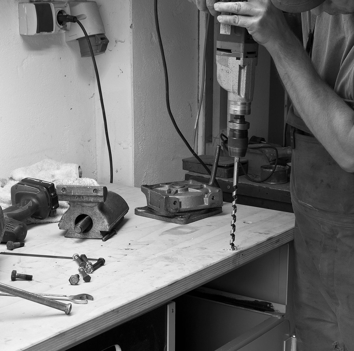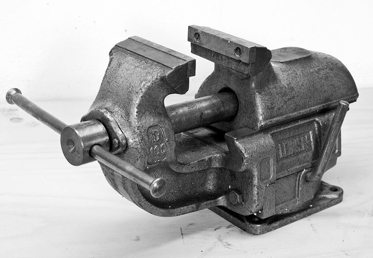 Unabhängig vom Typ des Schraubstocks sollte auch diese stählerne Faust unverrückbar mit der Werkbank verschraubt sein – nichts peinlicher als ein spontaner Hüpfer über die Tischplatte, weil man mit vollem Körpereinsatz am Bauteil würgt und der Schraubstock nachgibt. Diese eiserne Faust selbst soll so an der Platte sitzen, dass lange Bauteile nach unten herausragen können.