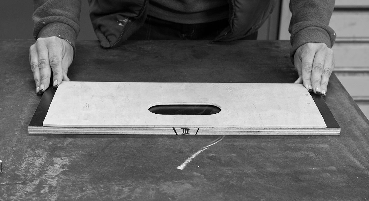 Wir verwenden hier eine frisch zugeschnittene, wasserfest verleimte Platte „Sonderklasse“, die sich bei anderen Möbeln als extrem robust und verschleißfest erwiesen hat. Selbst wenn ein Preis von vielleicht 150 Euro schmerzt: Noch peinvoller ist ein tiefer, zerfaserter Kratzer in der Oberfläche, weil eine Ölablassschraube des beherzt über die Platte geschrammten Getriebes die Fläche dauerhaft aufgerissen hat. Bei wirklich durablen Platten passiert das nicht.