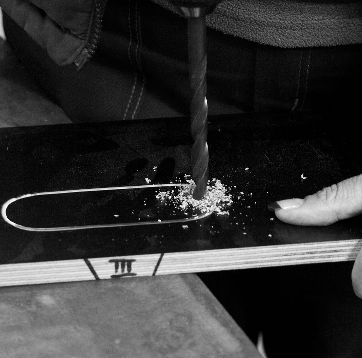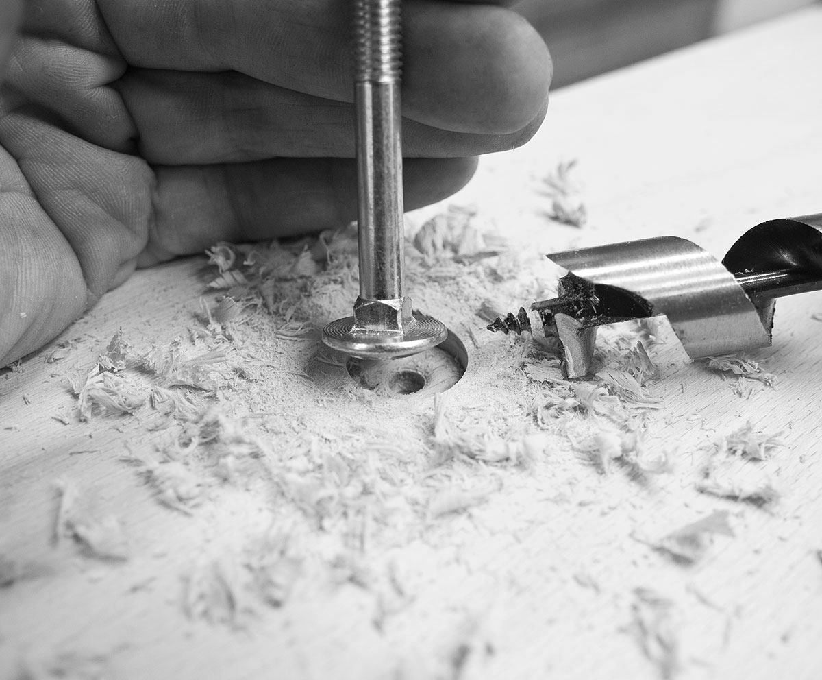 Aufgebohrt wird später, weil die Schlossschrauben auch versenkt werden sollen. Das geht formidabel mit einem Schlangen- oder Forstnerbohrer – hier dient das 3mm-Loch von unten als Zentrierung. Die Senkung so tief anlegen, dass der Schraubenkopf sicher verschwindet. Erst jetzt voll durch die Platte und die Streben bohren (z.B. M8 = 8mm+1mm Zugaben = 9mm). Anschließend die Platte an den Korpus schrauben. Falls kein geeigneter Bohrer zur Hand ist, lassen sich die Senkungen auch mit einem Stecheisen anfertigen, sind dann aber eben rechteckig.