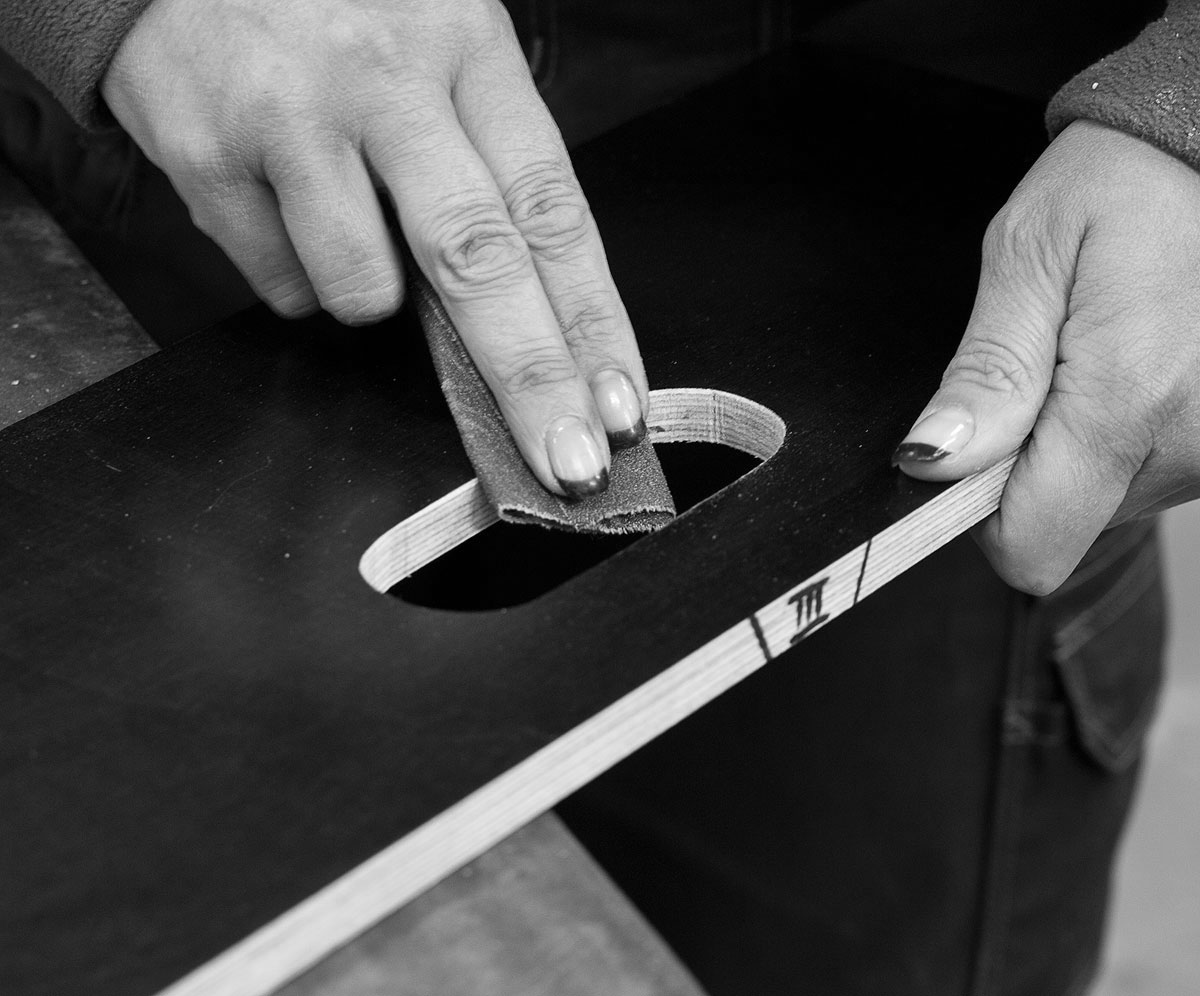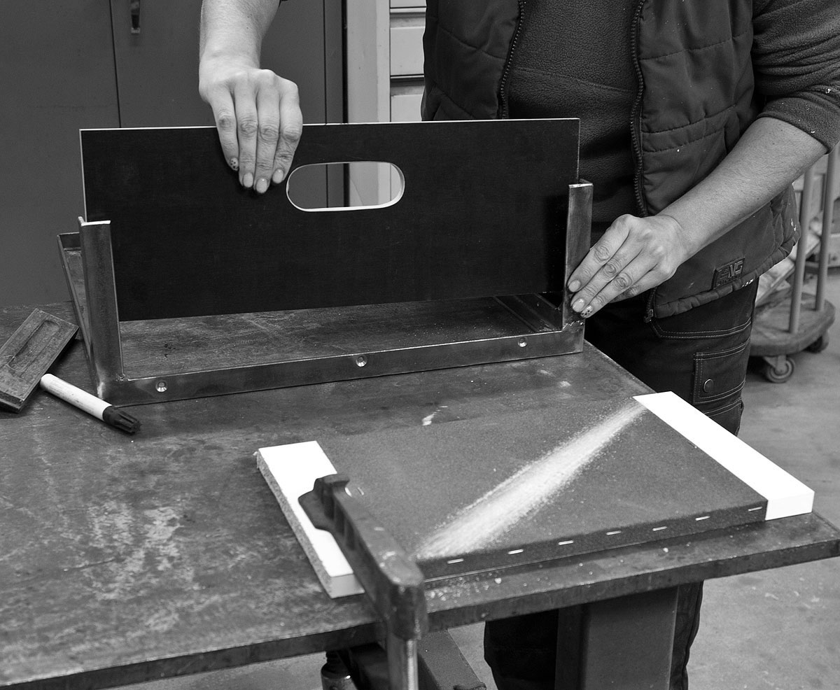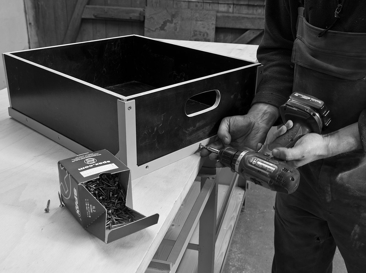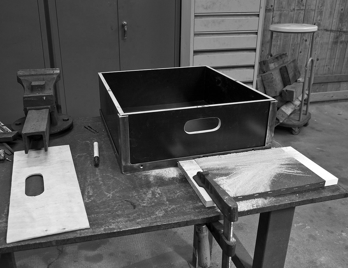 Für die Dimensionierung dieses Lochs geht man von der größten anzunehmenden Pranke aus, macht sich eine Schablone für alle Schubkästen und legt sie in die geografische Mitte der Frontplatte. Durchzeichnen, Anbohren und mit der Stichsäge eher zu knapp ausfiedeln. Da die Platten gegenüber Opel-Panzestahl und Audi-Titanblech recht weich sind, sollte die schlussendliche Form einer Halbrundfeile überlassen bleiben. Anschließend die Kanten mit ein wenig Schleifleinen brechen und alle Wände in den Stahlrahmen der Lade einfügen. Passt? Dann vorbohren und mit Spaxschrauben fixieren.