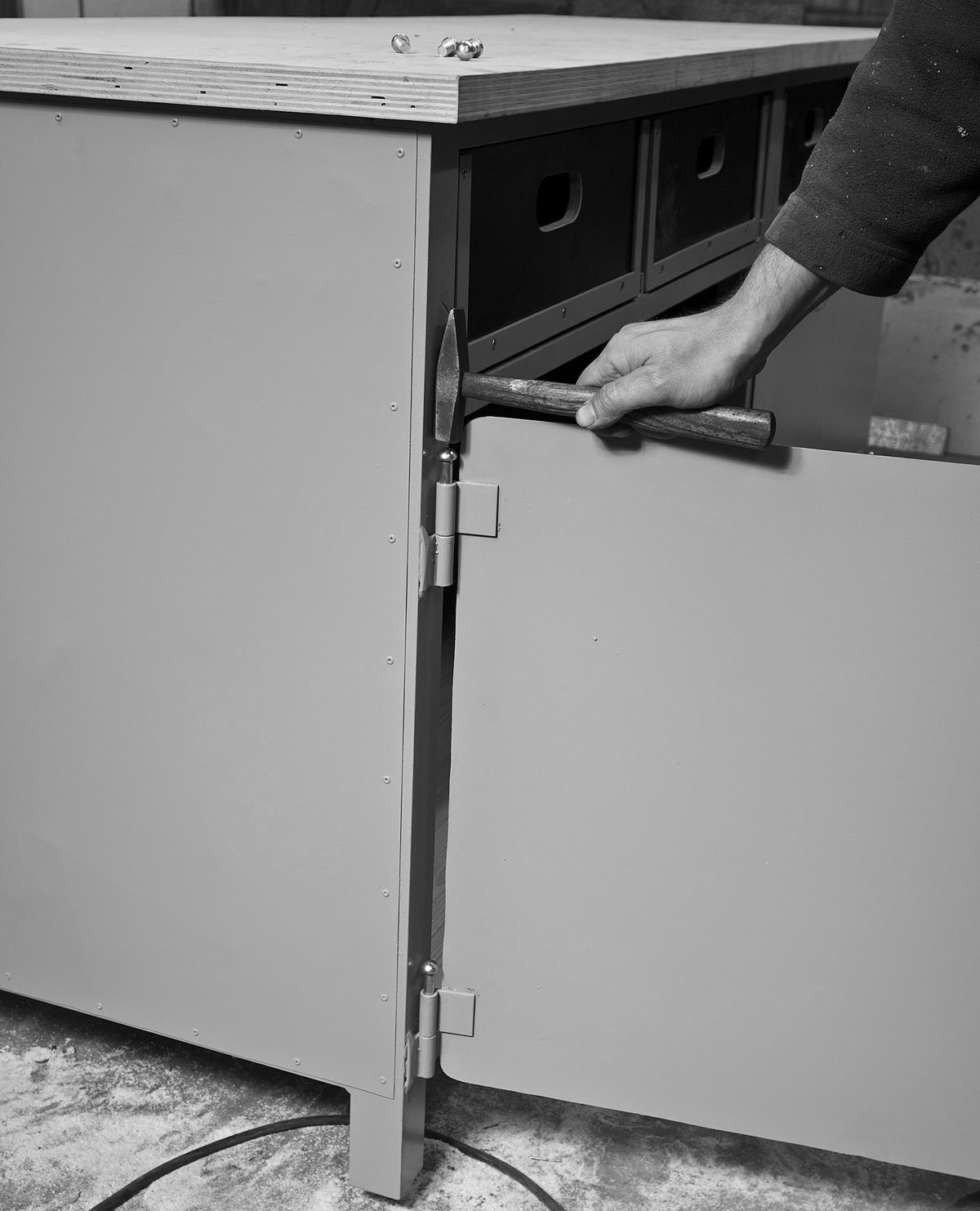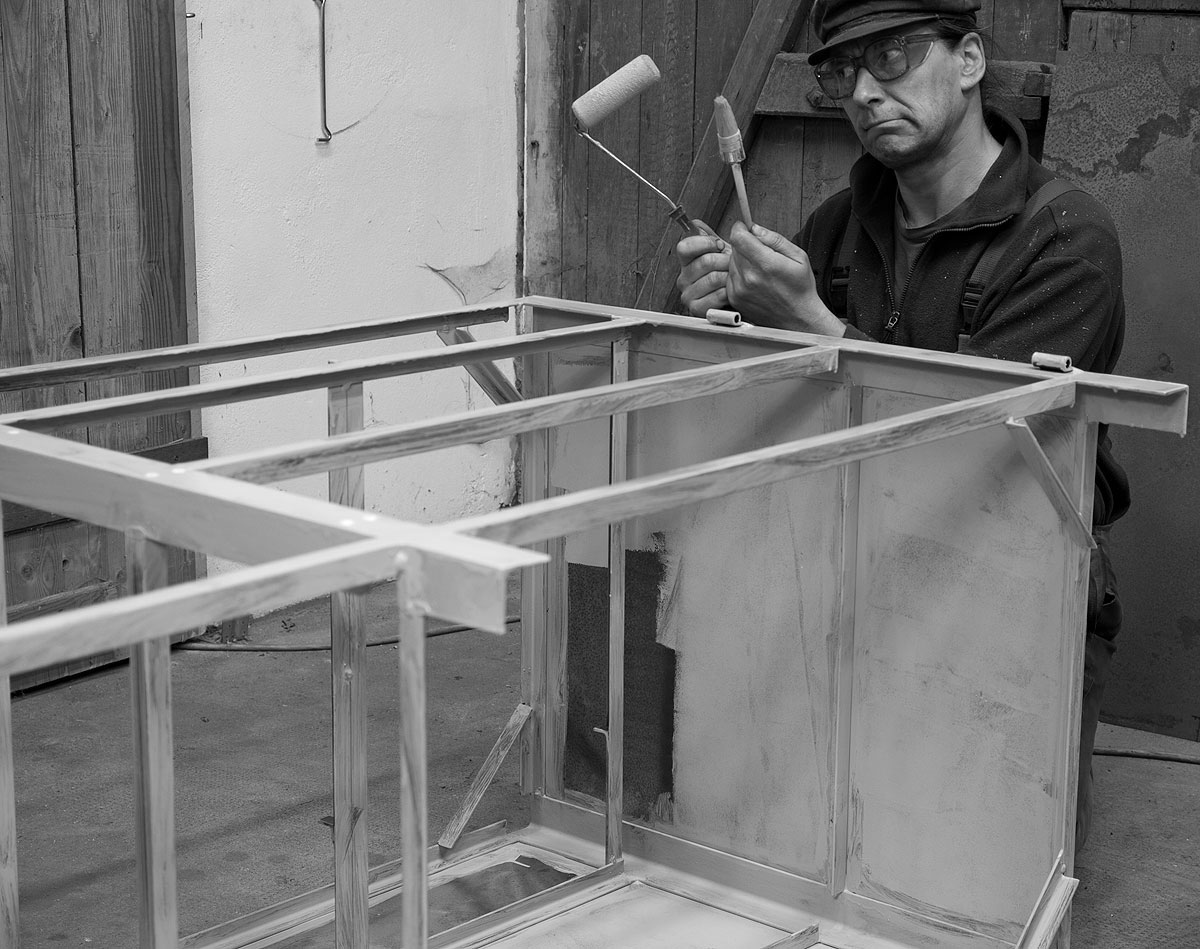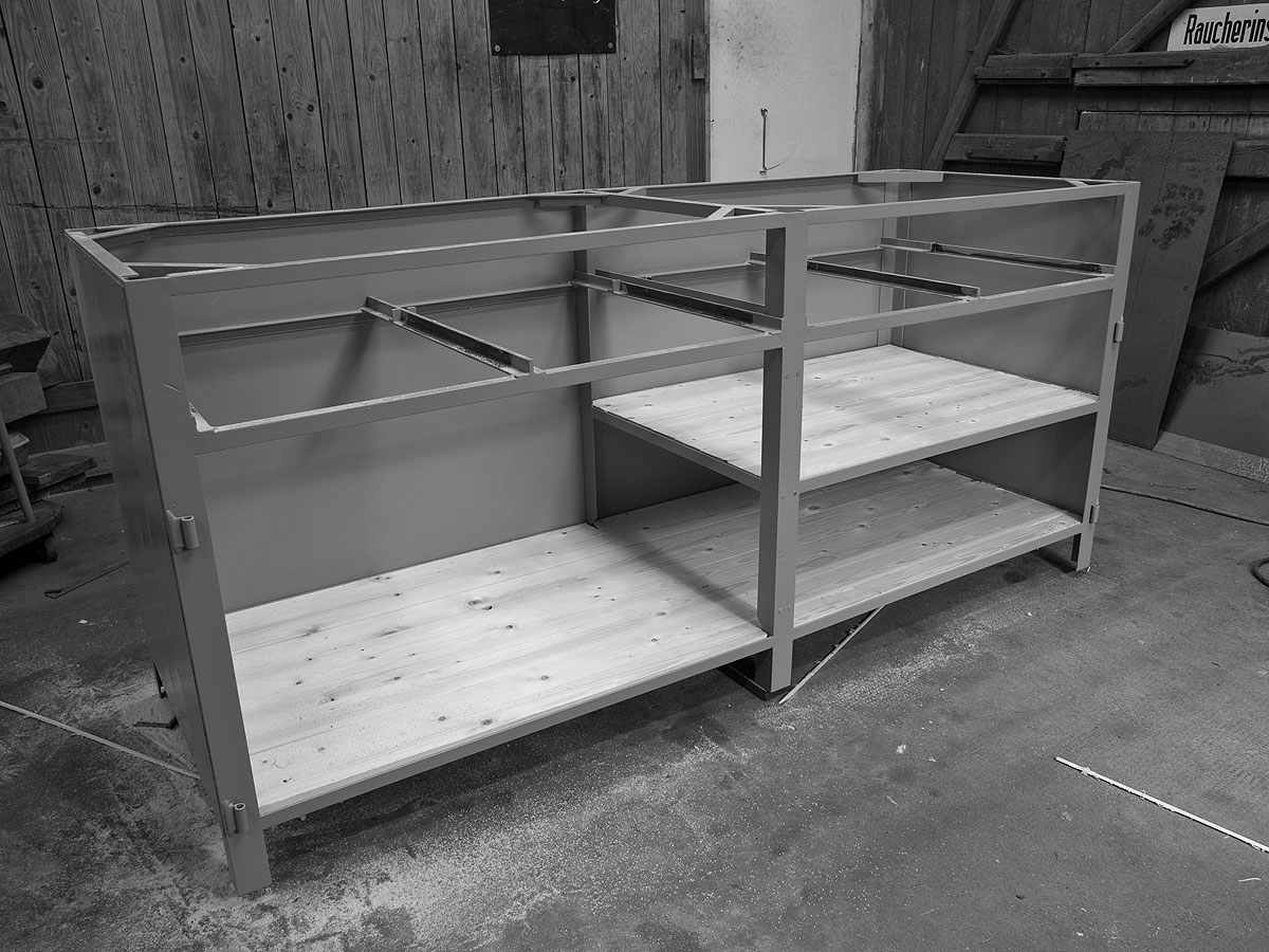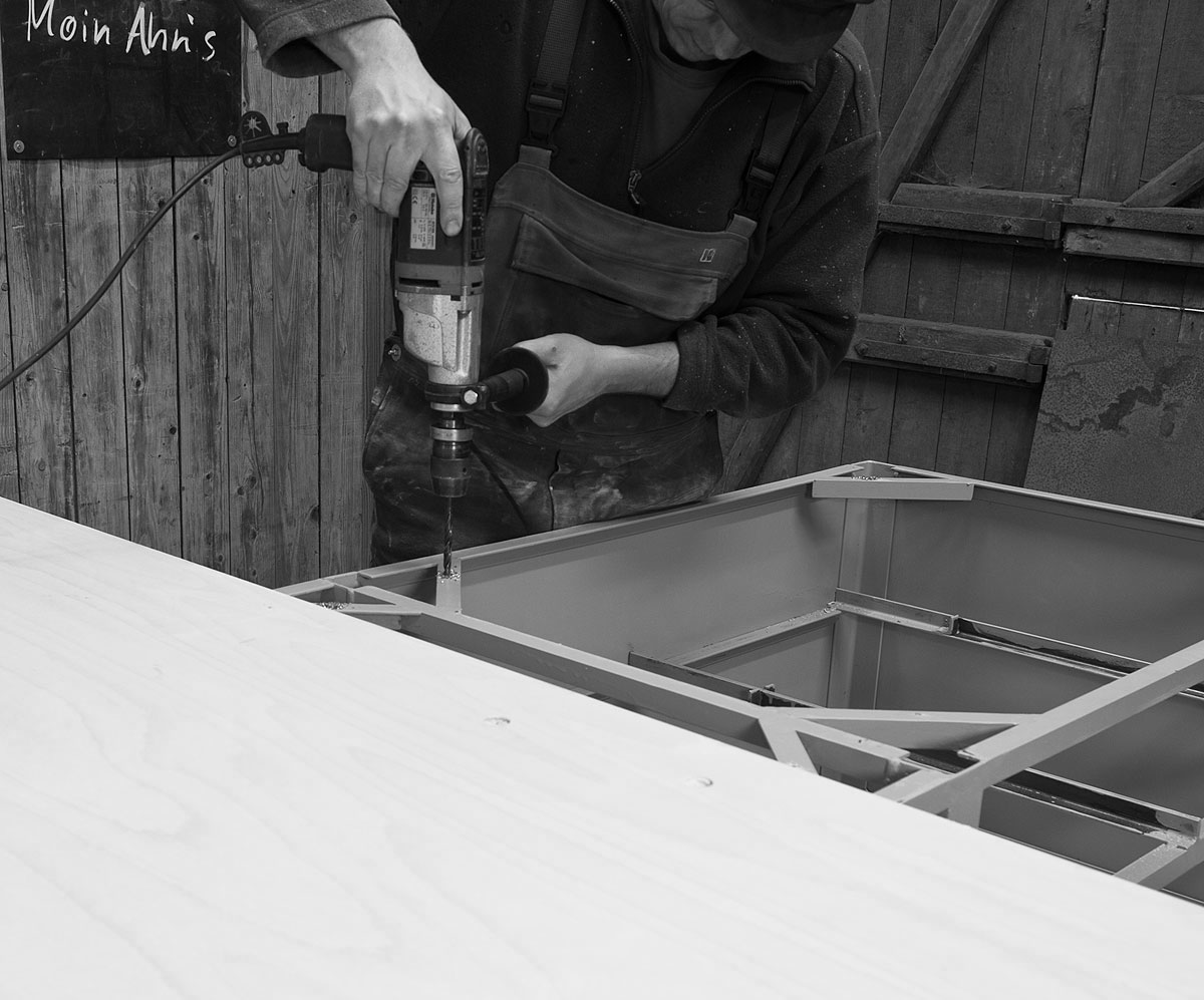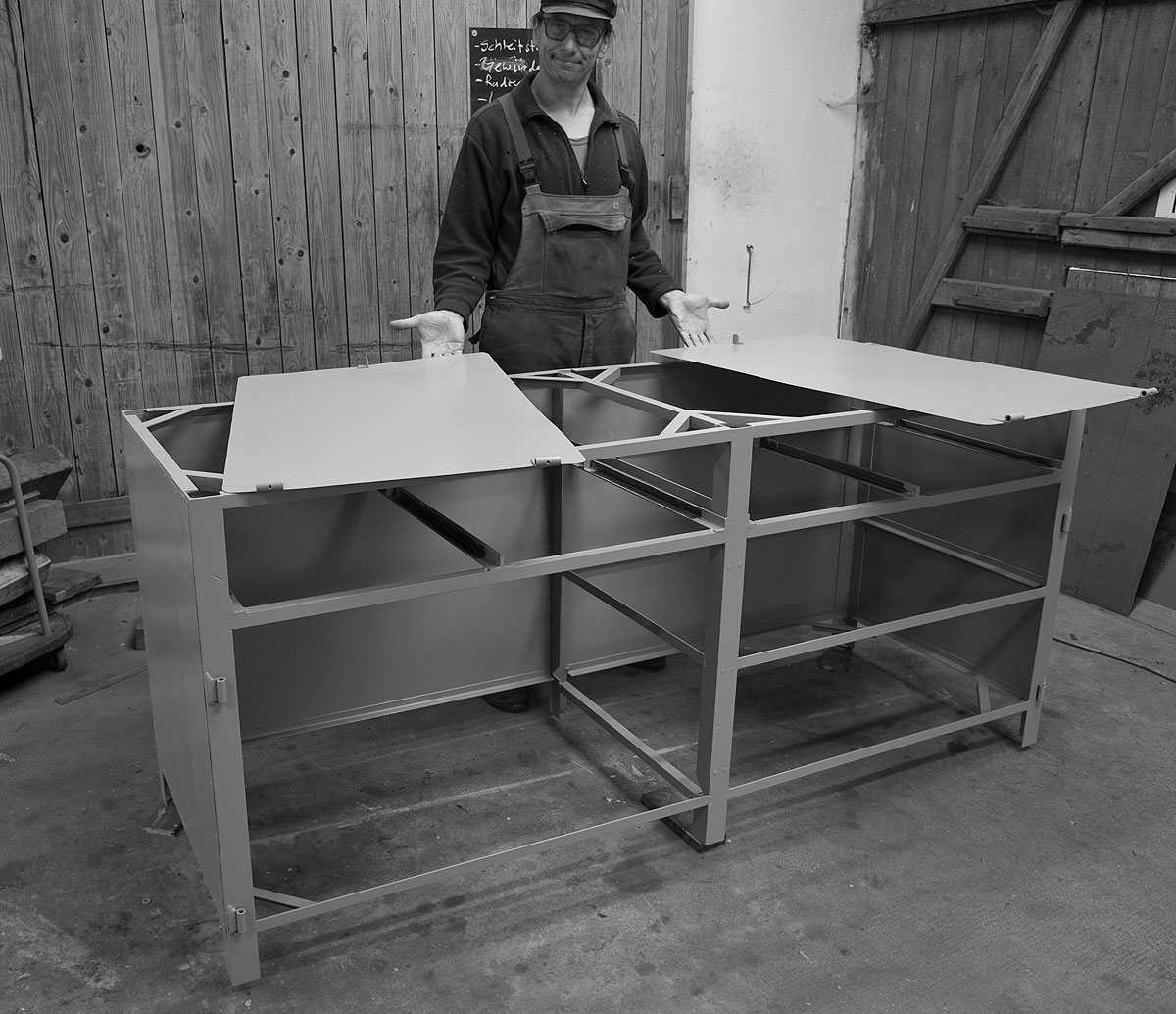 Wenn Korpus, Schubladen und Türen fertig in der Werkstatt lauern, verlangen sie nach Farbe. Die sollte idealerweise gut vor Rost schützen und gleichzeitig zum Buchsbaum-Parkett, dem Schlingenflor oder der Sammlung historischer Stadtansichten im Aufstellungsraum passen. Weil maschinengrün nicht mit allem harmoniert, wird dieses Exemplar in lebensbejahendes schiefergrau eingekleidet.