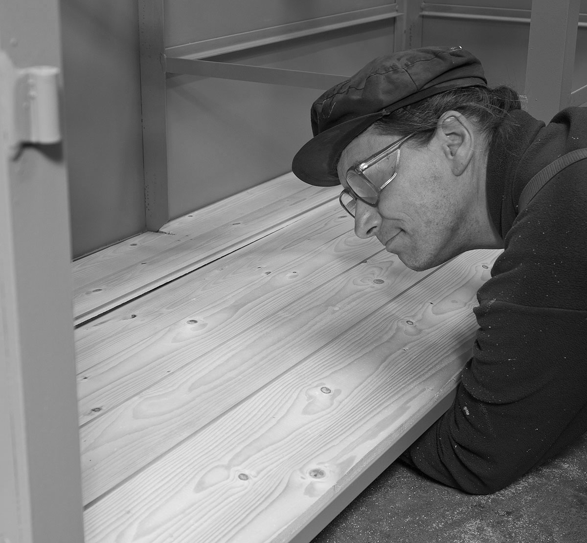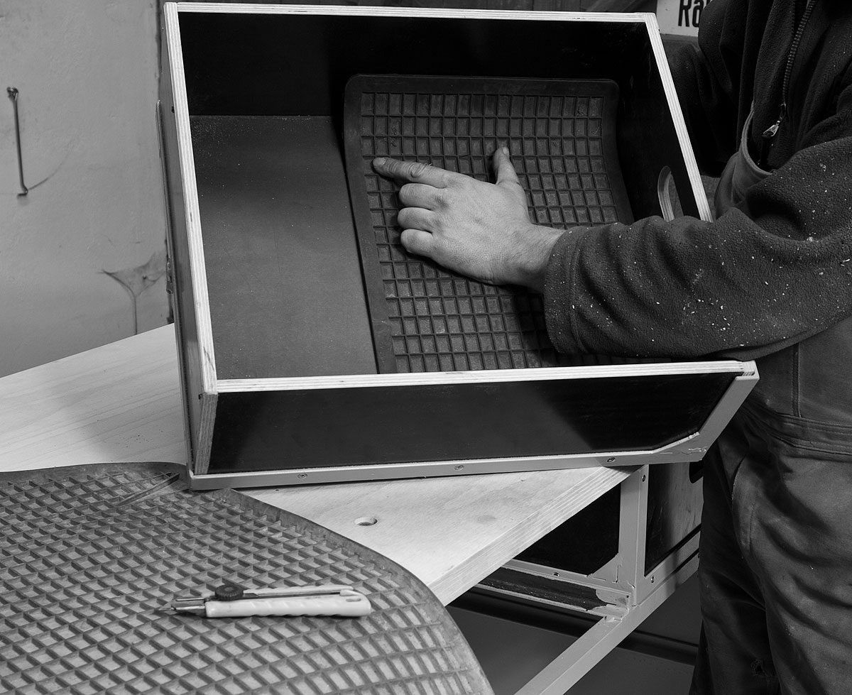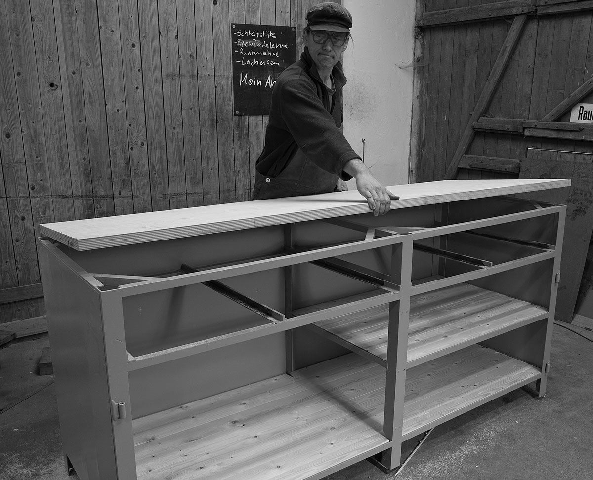Um die abgelängten Dielen in den unteren Boden zu zirkeln, ruft man „La Ola“, legt die stramm passenden Dielen in einer Welle ein und drückt sie flach. Spätestens hier wird auch klar, warum die mittleren Stützen des Korpus unten ausgeklinkt sein müssen; ohne diese Ausklinkung gelangen die Bretter nicht an ihren Platz. Dass statt gekauftem Holz prinzipiell alles, auch z.B. alte Containerböden verwendet werden können, versteht sich von selbst. Einzig: stabil muss der Boden sein. Im Fall der Containerböden ist deren Wahl deswegen nicht abwegig. Diese schichtverleimten Platten widerstehen Salz, Feuchtigkeit, tropischer Hitze und radikaler Beanspruchung durch übellaunige Staplerfahrer.
