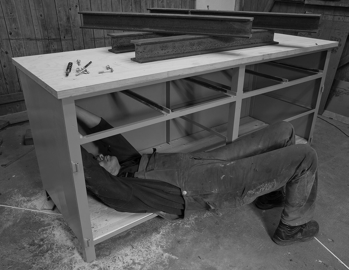 Damit das Möbel auch als Panzersperre dienen kann, muss die Platte fest mit dem Korpus verschraubt sein. Prinzipiell reicht dazu eine handvoll Spaxschrauben von unten in der Platte; der hartgesottene Schrauber vertraut jedoch lieber Schlossschrauben, vorzugsweise M8 oder größer: In die Querstreben der oberen Ebene von oben vorbohren und die Platte so auflegen, dass sie an allen Seiten wie gewünscht übersteht. Anschließend ausreichend Ballast auf die Bank werfen und von unten durch Strebe und Platte mit 3 mm bohren.